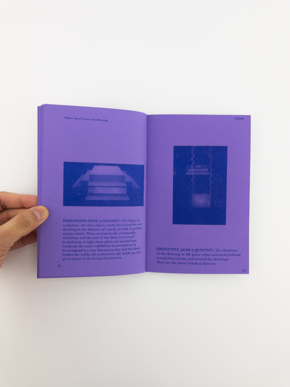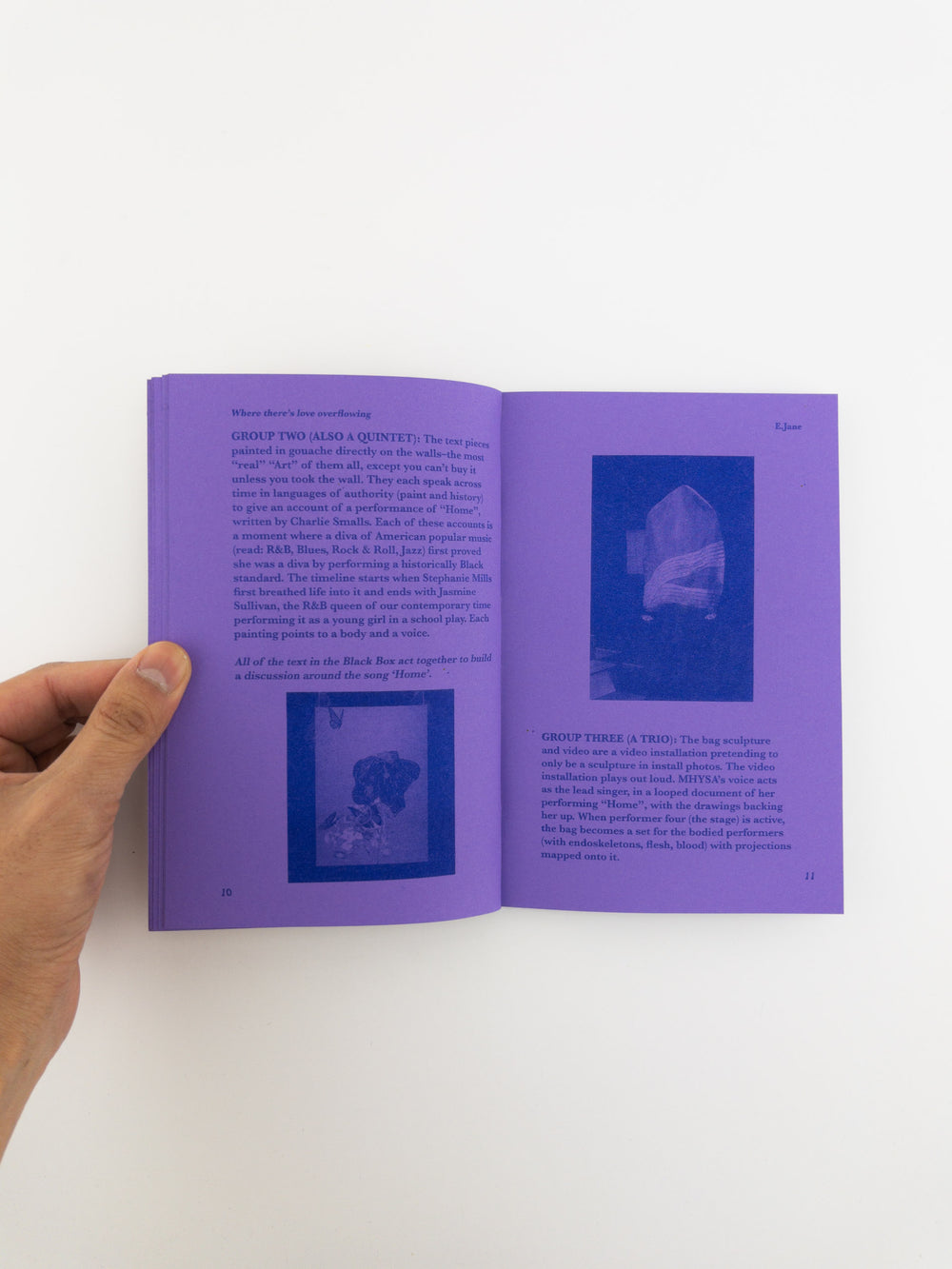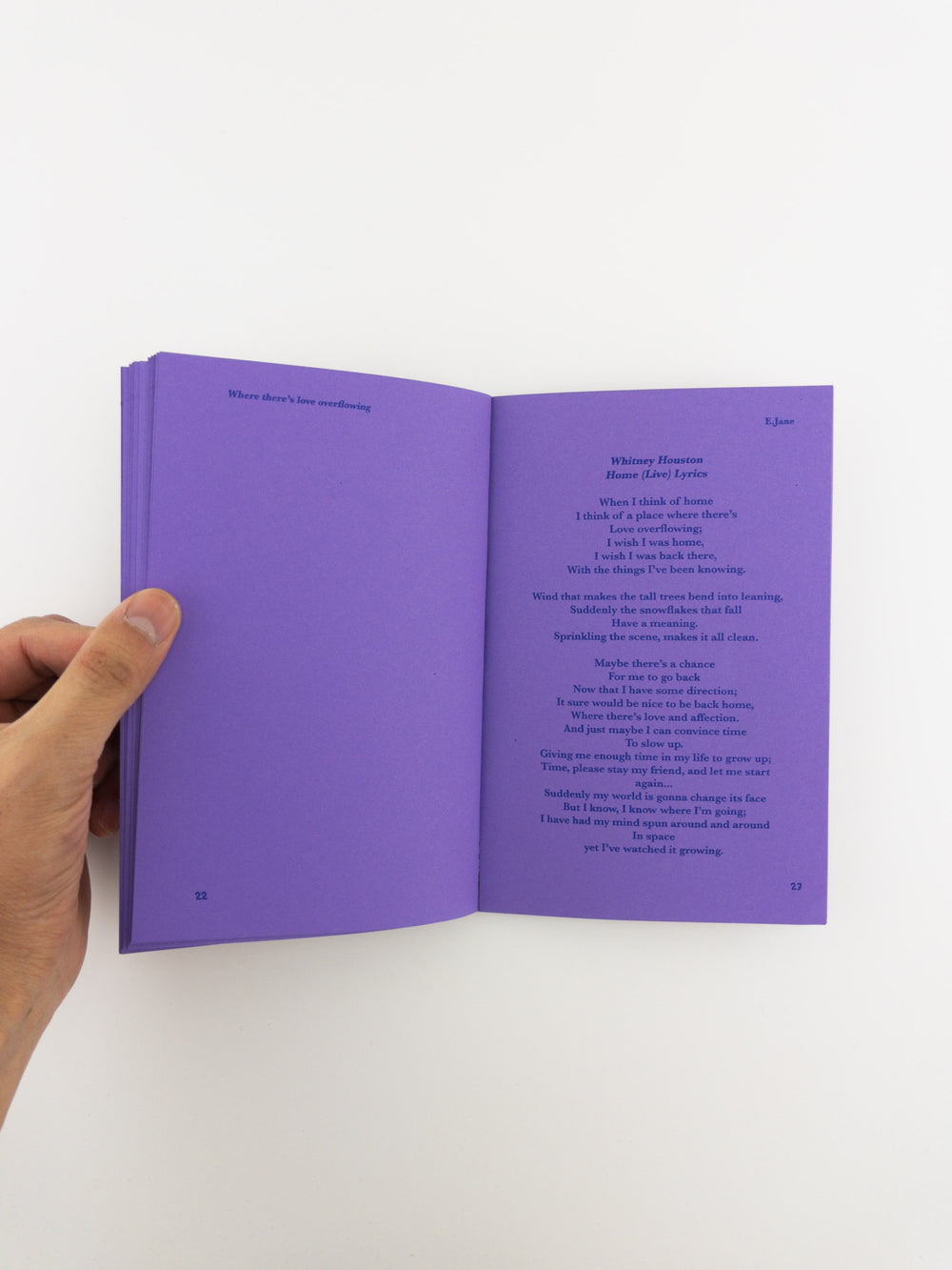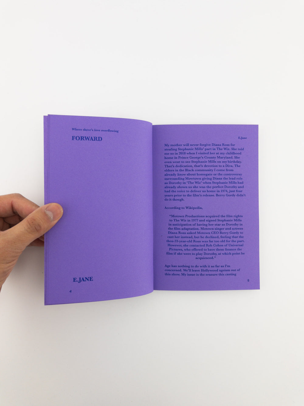 Where there’s love overflowing is a publication by E.Jane published by GenderFail in conjunction with the exhibition E Jane; Where there’s love overflowing, April 1-May 14, 2022 at The Kitchen. Where there’s love overflowing expands on the exhibition themes based on the powerful ballad “Home”, originally sung by Stephanie Mills as Dorothy in The Wiz in its Broadway premiere in 1975 and includes images and text featured in the exhibition. The publication also features new commissioned essay, TITLE HERE, by artist and writer Hannah Black, written exclusively for the publication.