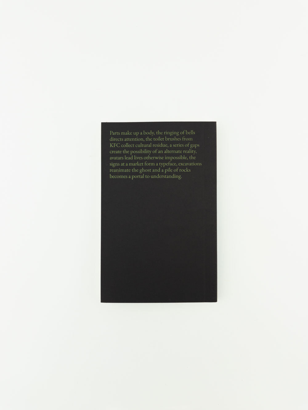 Parts make up a body, the ringing of bells directs attention, the toilet brushes from KFC collect cultural residue, a series of gaps create the possibility of an alternate reality, avatars lead lives otherwise impossible, the signs at a market form a typeface, excavations reanimate the ghost and a pile of rocks becomes a portal to understanding.
