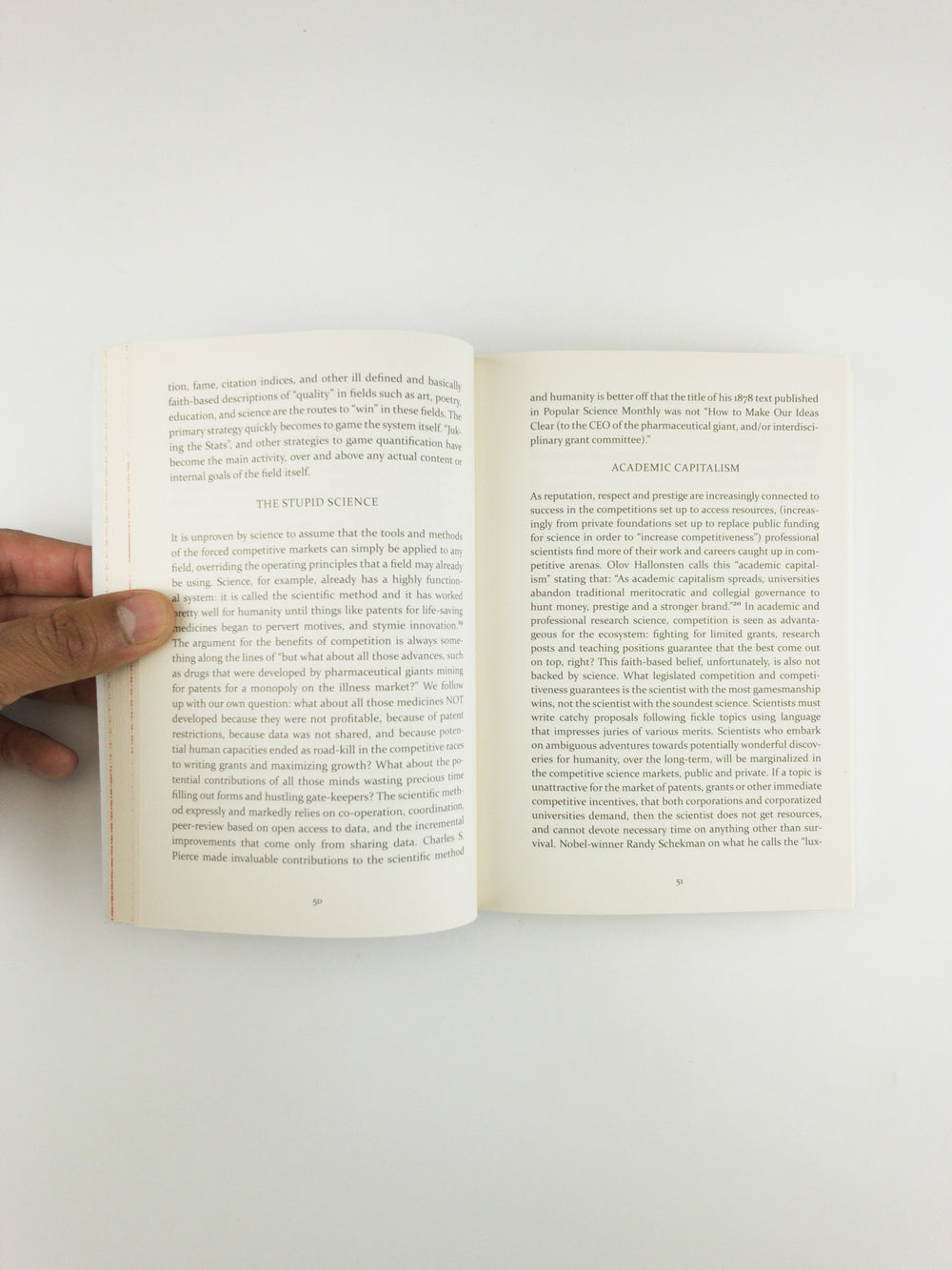 Fields such as art, science, and education are antithetical to the goals of neoliberal quantification, gamification, and resulting private appropriation of everything. However, even these fields are forced to comply and compete, to great detriment of the independent goals of these fields, through coerced competition for resources via constant demands for performance metrics. For most of us it is impossible to step outside the legislated competitions of neoliberalism and so individuals must be well adjusted within the system, enabled by realist-conformist postures.