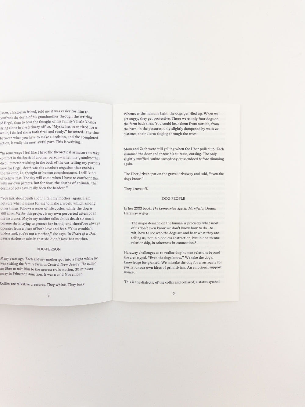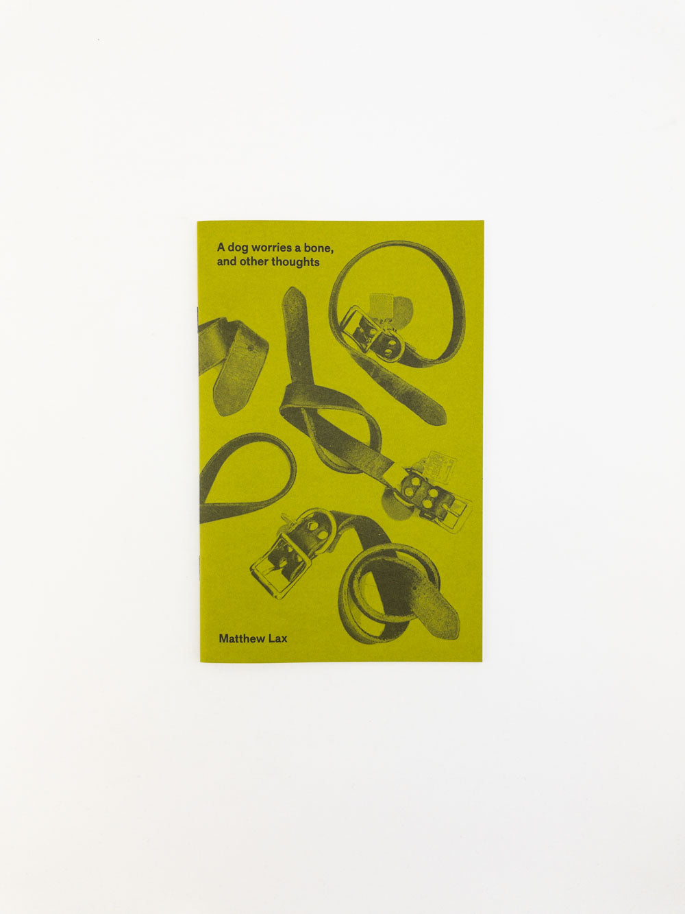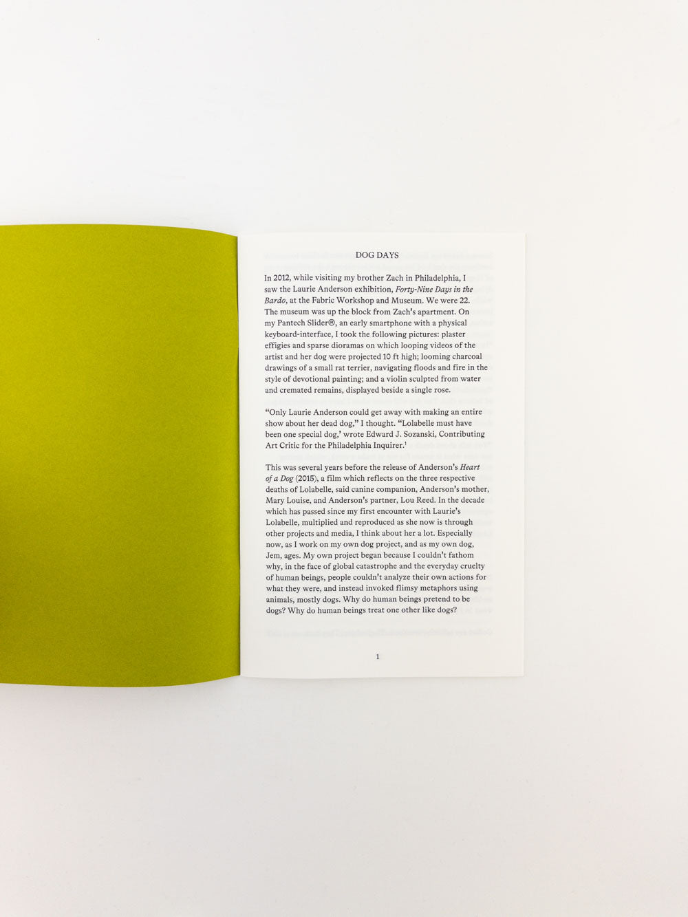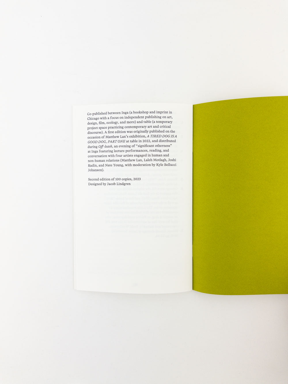 First published on the occasion of the exhibition, “A TIRED DOG IS A GOOD DOG, PART ONE” at table (Chicago) April 29 - July 2, 2022, with a second re-print published in 2023.