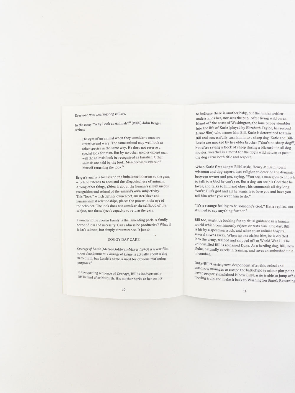 An experimental essay by Matthew Lax which explores discipline, faith, disability and family alongside the production of his long-term multimedia project, “A TIRED DOG IS A GOOD DOG.” Mining his own autobiography as a queer, Jewish quadruplet growing up on a Collie-breeding farm in New Jersey, Lax considers puppy play and his own process in conversation with other dog films, dog ideas and dog projects by Laurie Anderson, Donna Haraway, Franz Kafka, Diana Thater, as well as the Lassie franchise and others.