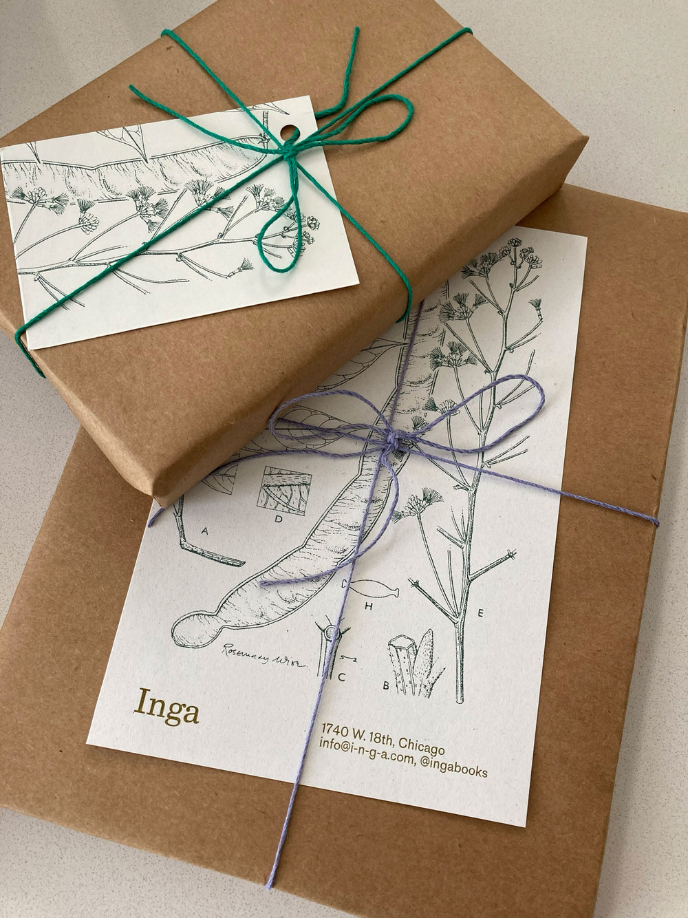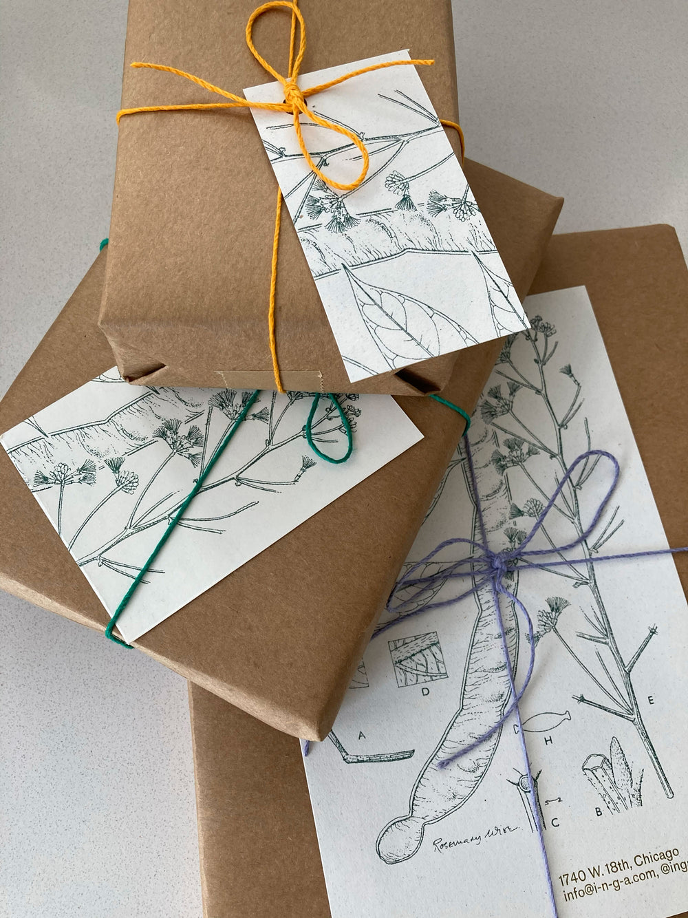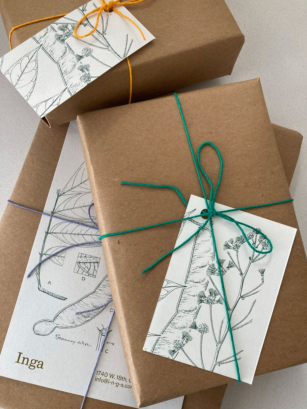 Let us wrap for you. Gift wrapping is comprised of durable kraft paper, brightly colored twine, and a tag made from print offcuts. If you'd like a brief message or name written on the tag, or have any other requests, let us know via the comment section on the Basket page or send us a note to info@i-n-g-a.com.