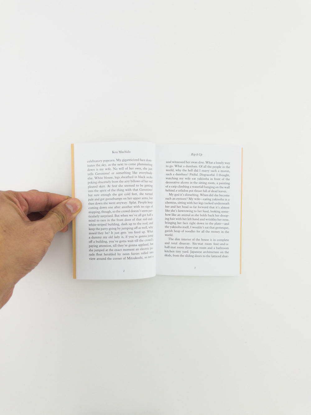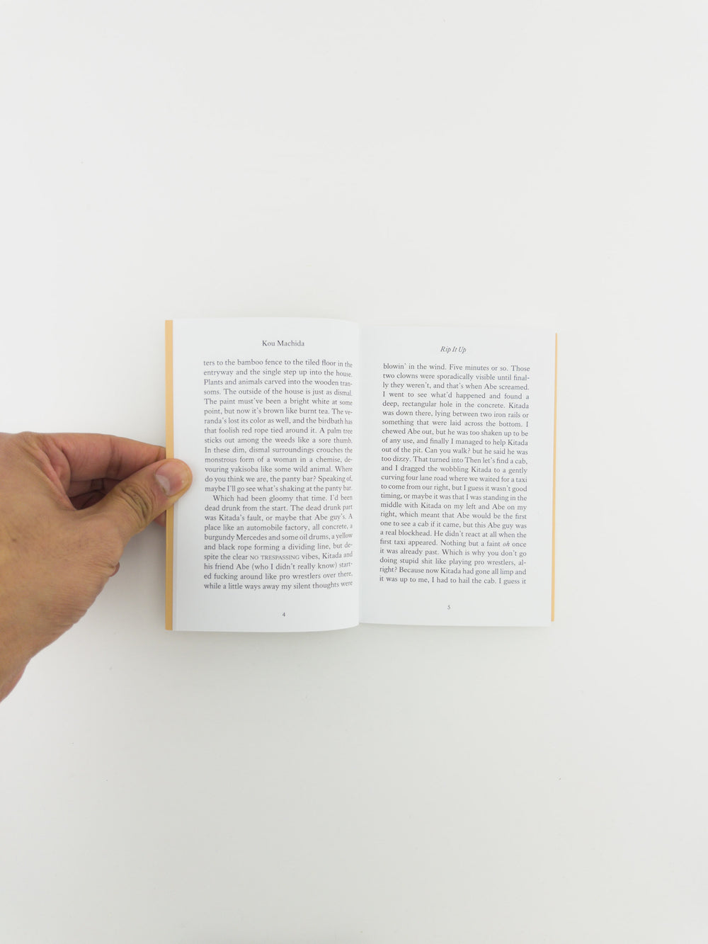 Set in a kaleidoscopic hyperreal Japan circa Y2K, Rip It Up catalogues the misdeeds and misgivings of a down-and-out wannabe debonair who ekes out a meager living at the fringes of the art world, wracked by jealousy at his friend's success and despondency of his own creative (and moral) bankruptcy. In turn hilarious and also horrifying, Machida's pyrotechnic prose plumbs the discursive depths of the creative spirit, a head-spinning survey of degeneration and self-sabotage.