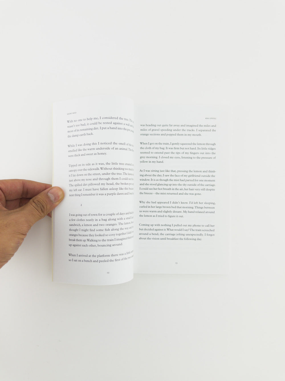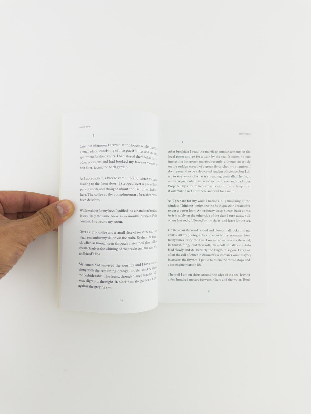 Night Rind, a novella, is a first person narrative that breathes in a world of micro erotics—found in mundane hauntings, sonic emergences, touched food, accumulative bug, etc. It was made from a place of thinking about somatic texts—ones that encourage or emerge with bodily feeling such as the romance novel and the cookbook. The novella ends with two auto-theory essays on grottos and mood lighting respectively.