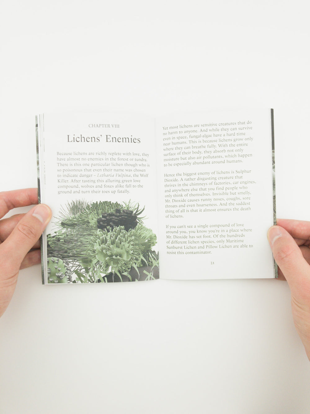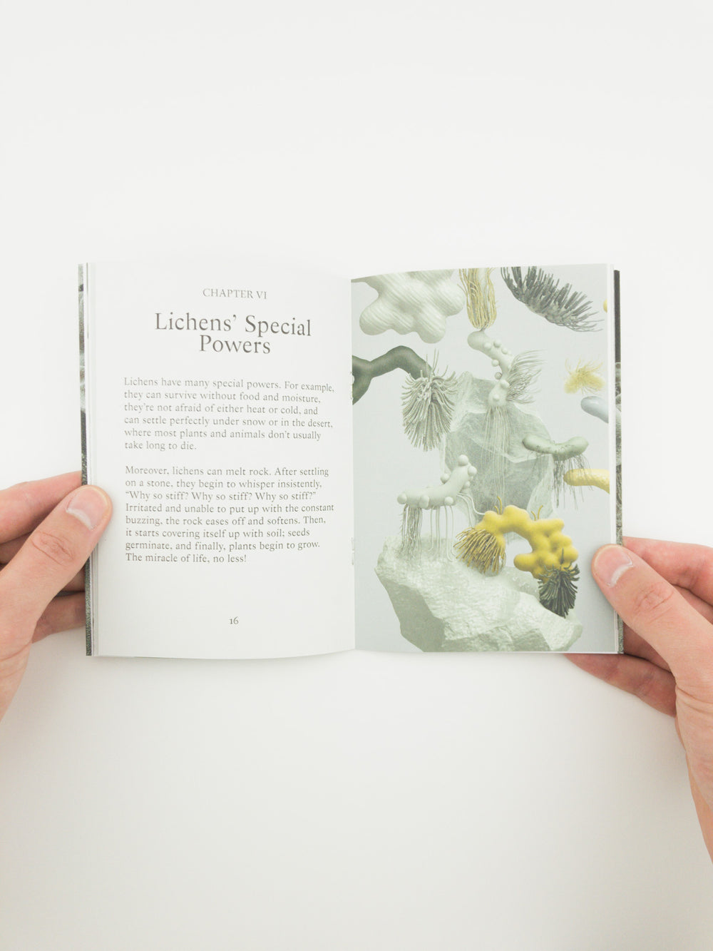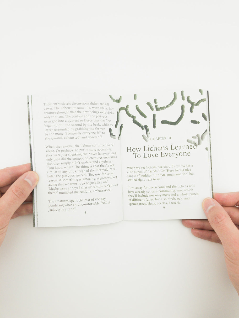The Secret Book of Lichens written by Kristupas Sabolius, and illustrated by Aistė Ambrazevičiūtė is a walk through the mind and imagination of lichens spread across the forest. The short stories tell of lichen love, their mathematics, values and other important things. These compound creatures are never alone and know great ways to make friends. Perhaps that's why, when looking at lichens, people understood what symbiosis is - knowing how to live together. Composed of allied fungus and algae, these creatures have special powers - for example, they can easily survive in space and melt rocks. And this one particularly special lichen, Graphis scripta, was even called the script of the forest.