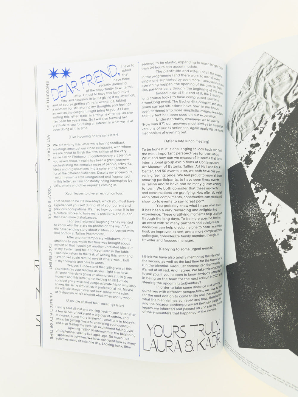 was initiated by Sandra Nuut and Ott Kagovere at the Graphic Design Department of the Estonian Academy of Arts. The letters were born with the idea to cultivate design writing culture and connect with the community at home and abroad. The publishing project dedicated itself to covering ideas, events, and more in design and visual culture in a letter format bringing together various authors. The edition was in the beginning 100 to later 200 letters each month, which were riso-printed and hand-folded in a collaborative manner. Half of the edition was distributed locally and another half globally, traveling to design institutions, schools, and professionals.