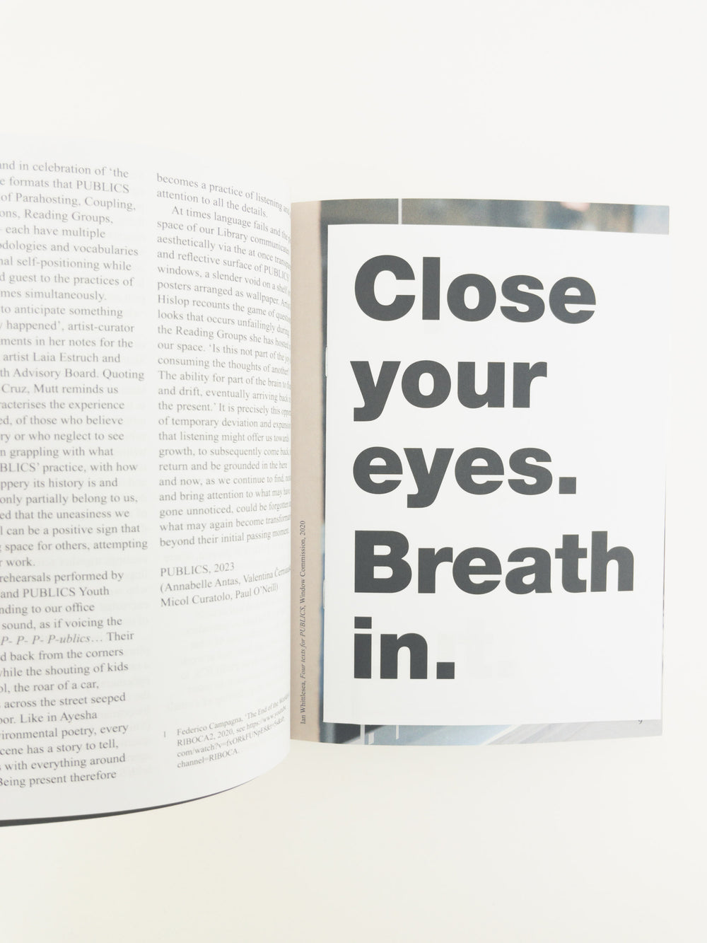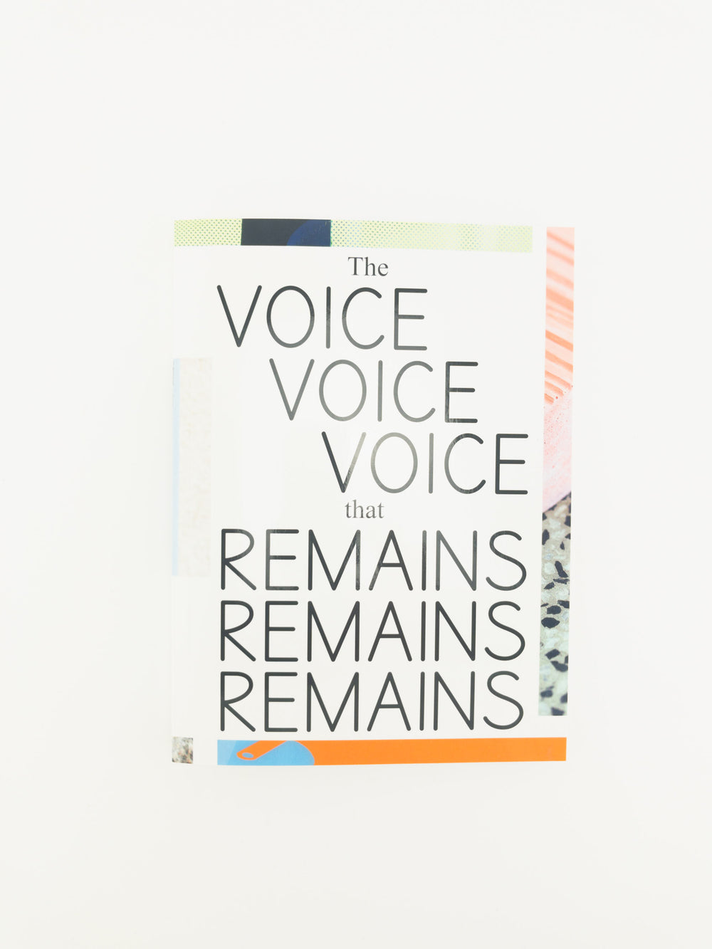 The Voice that Remains is a kind of retrospective; a looking back at material, digital and archival traces left behind within the physical and situated space of PUBLICS, and in the bodies, voices and memories of those who have worked with us in the past years. Each photo, mark and word collected in these pages reflects a collective happening and the labour undertaken to bring a work of art or a piece of research into PUBLICS to be shared with others. The Voice that Remains is a snapshot of PUBLICS’ present, where we, who have only recently come to be part of its making, have gathered some of the traces of its programme, keepsakes and leftovers of the last half decade or so. What’s left behind as reminders, remainders or rememberings of what once was, is what we have had to work with – to learn how to be PUBLICS, to decide on how to move next, to insert ourselves into the shapeshifting of a small cultural organisation.