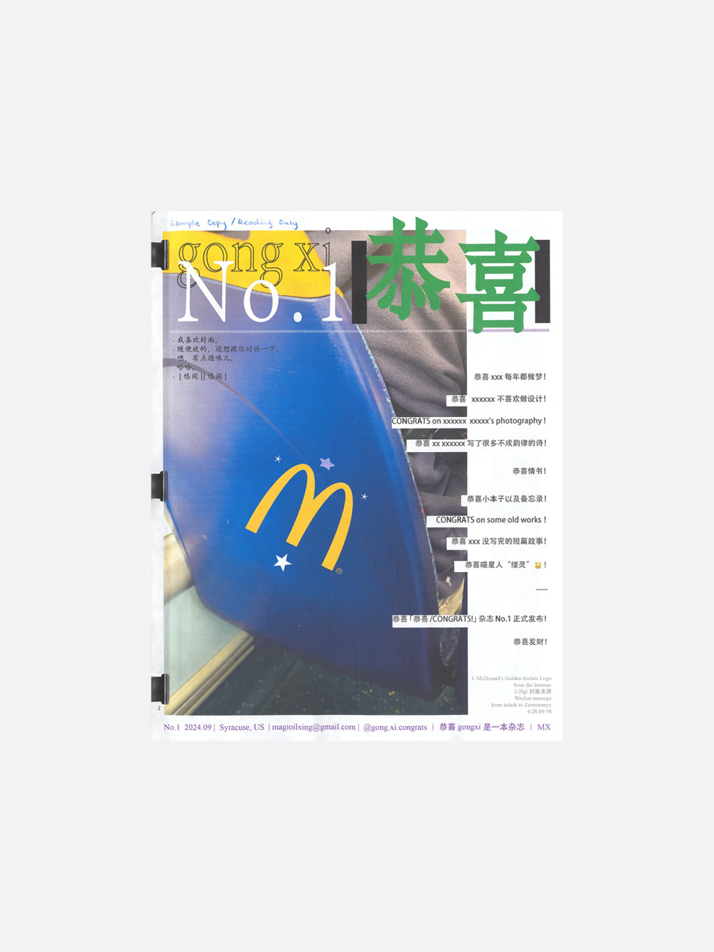 No.1 is the first official issue of the magazine 「恭喜/congrats!」. Evolving from the experimental No.0, No.1 represents the transition from an artist zine to an "almost fully-fledged" general audience publication. Showcasing a diverse range of creations and non-creations from various backgrounds and forms, No.1 features poems, dream narratives, chat arguments with a date, an ongoing short story, estranged friends' love letters, a mother’s diary on daughter’s beloved cat...