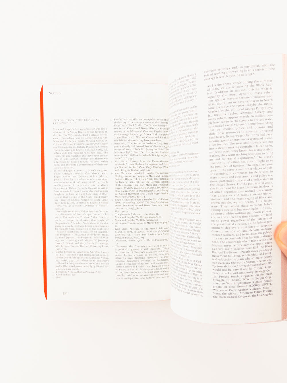 “Reading is class struggle,” writes Bertolt Brecht. Politically Red contextualizes contemporary demands for social and racial justice by exploring the shifting relations between politics and literacy. Through a series of creative readings of Karl Marx, Rosa Luxemburg, Walter Benjamin, W. E. B. Du Bois, Fredric Jameson, and others, it casts light on history as an accumulation of violence and, in doing so, suggests that it can become a crucial resource for confronting the present insurgence of inequality, racism, and fascism. Reading between the lines, as it were, and even behind them, Cadava and Nadal-Melsió engage in an inventive mode of activist writing to argue that reading and writing are never solitary tasks, but always collaborative and collective, and able to revitalize our shared political imagination. Drawing on what they call a “red common-wealth”—an archive of vast resources for doing political work and, in particular, anti-racist work—they demonstrate that sentences, as dynamic repositories of social relations, are historical and political events.