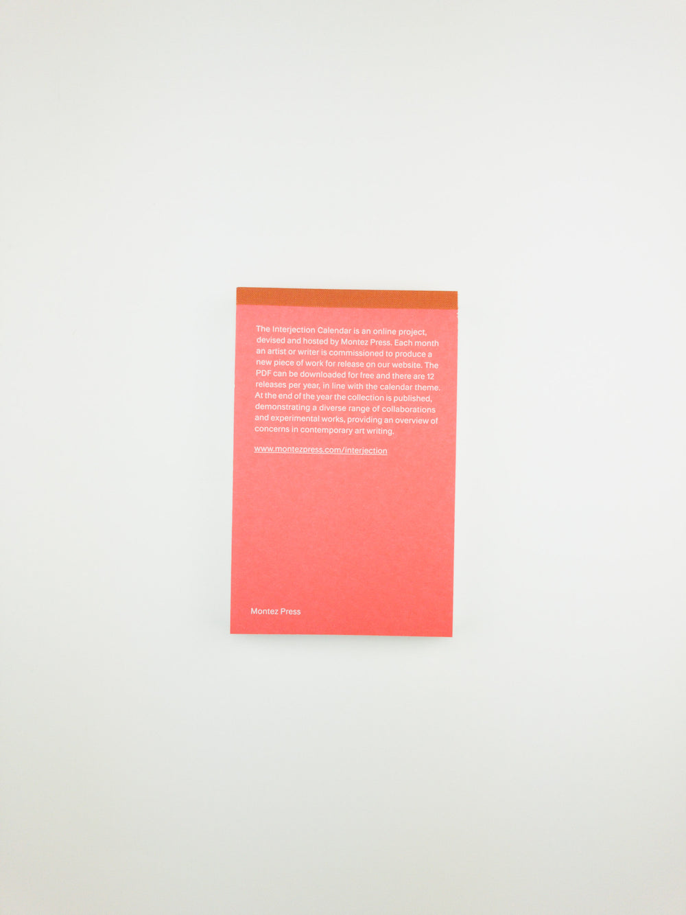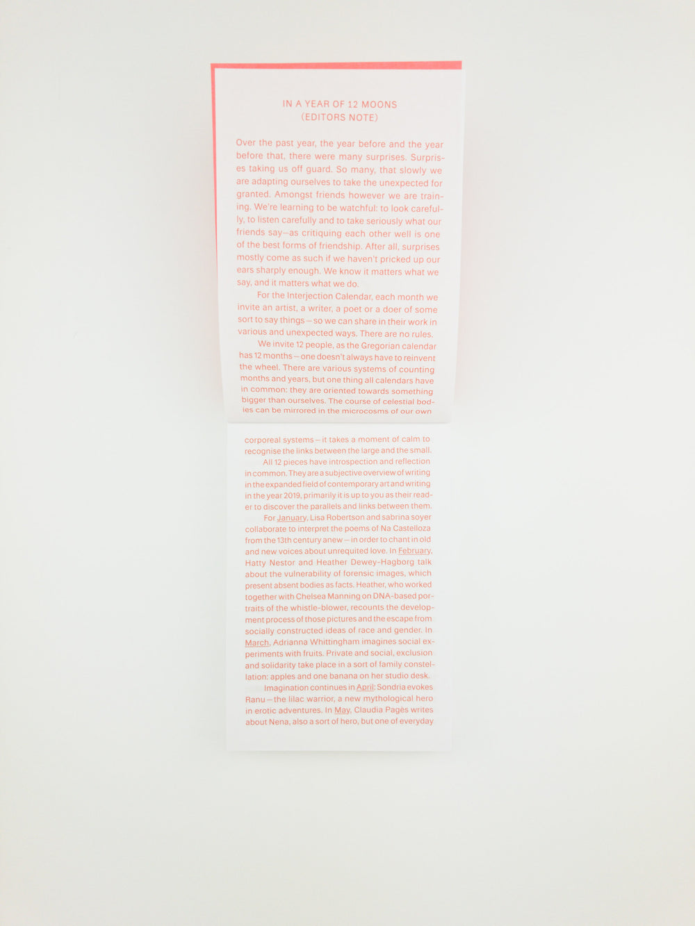 All 12 pieces have introspection and reflection in common. They are a subjective overview of writing in the expanded field of contemporary art and writing in the year 2019, primarily it is up to you as their reader to discover the parallels and links between them. This is the Interjection Calendar 2019, the fifth collection in this series. Don’t be surprised if next year we invite another 12 contributors.