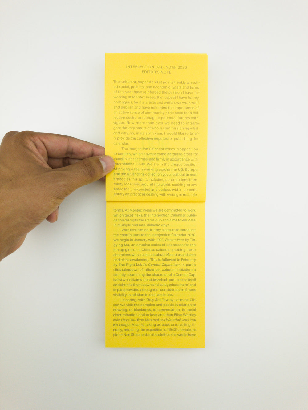 The turbulent, hopeful and at points frankly wretched social, political and economic twists and turns of this year have reinforced the respect we have for the artists and writers we work with and publish, and have reiterated the importance of an active sense of community and the need for a collective desire to reimagine potential futures with vigour. The Interjection Calendar exists in opposition to borders, which have become harder to cross for many in recent times, and firmly in accordance with international unity. The collection you are about to read embodies this spirit, including contributions from many locations around the world, seeking to embrace the unexpected and curious within contemporary art practices dealing with writing in multiple forms.