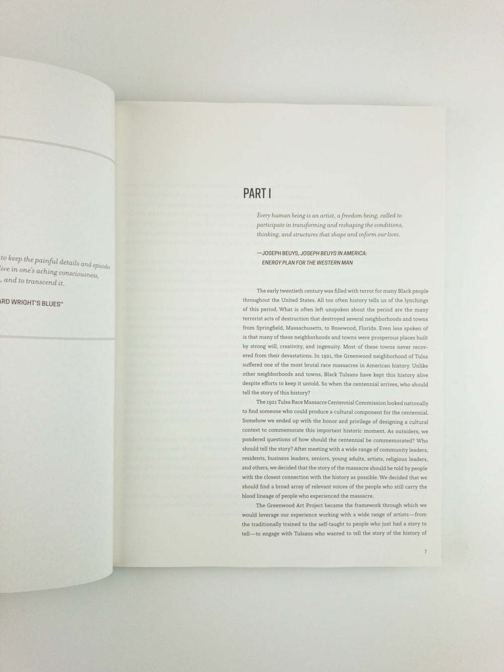 An Impulse to Keep is published on the occasion of the Greenwood Art Project, an initiative led by artists Rick Lowe/william cordova with Jerica Wortham, Marlon Hall, Jeff Van Hanken and Kode Ransom. The project brings together artists, residents, leaders, organizations, and businesses to raise awareness of the 1921 Tulsa Massacre and the destruction of its thriving Black community in the historic Greenwood District that included Black Wall Street, one of the most prominent Black-owned business districts in the United States during the early 1900s.