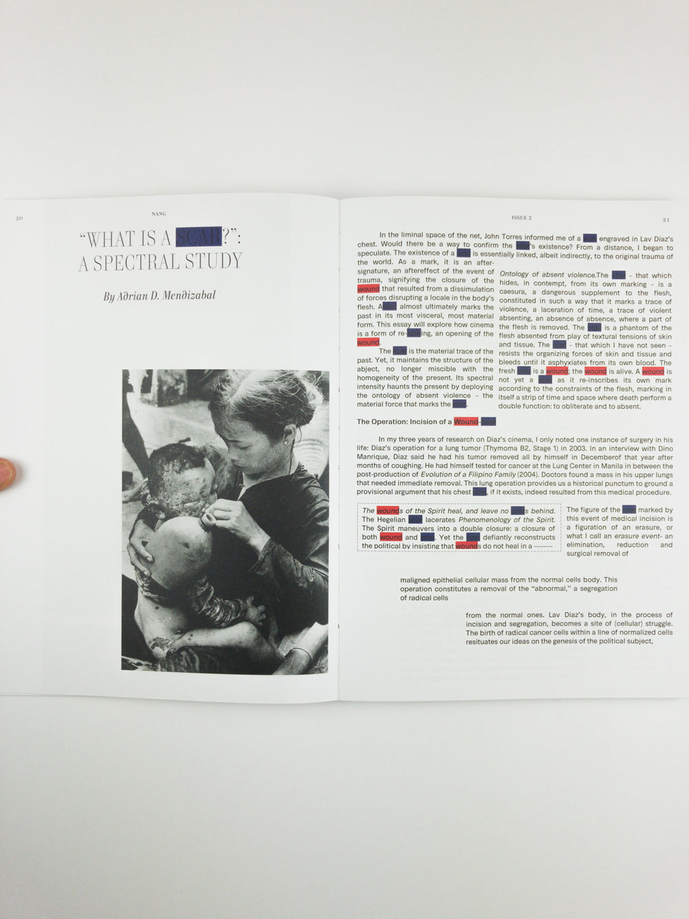 Issue 2 is dedicated to Scars and Death. We asked writers, filmmakers, scholars, bloggers, and artists from Japan, South Korea, the Philippines, the USA, Indonesia, Singapore, Vietnam, India, and Kazakhstan to pitch in without feeling the need to conform to a particular form or tone of writing. Write about scars and death. Die for the piece and swear by it. For the scarred workers, the dedicated, the desperate enough, for those dying to be offered another chance. For the films we have lost, the scenes that are scarred by time, those missing frames, abrupt endings and low resolutions. For the ones who died on- and off-screen, for deaths we haven’t seen. For those who risk life savings for a fictional piece. For all others who toil away, INT/EXT, their bodies taking it, DAY/NIGHT.