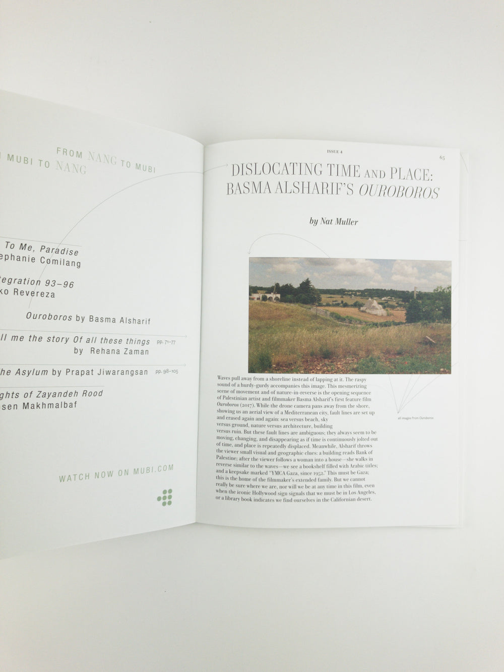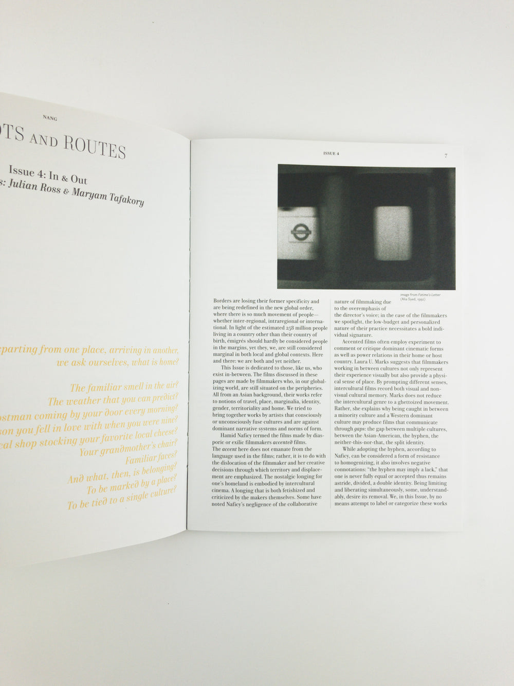 Issue 4 is dedicated to In & Out. Featuring artists and filmmakers who voluntarily or involuntarily moved outside of their country of origin, this Issue focuses on hyphenated identities and films that exist in the in-between. Inspired by Hamid Naficy’s “accented cinema,” the texts offer a glimpse into what an intercultural genre and films might look like and whether the de-territorialization of the filmmaker produces certain traits and characteristics that these films share. Ranging from image-led dialogues to in-depth essays, this Issue hopes to serve as a counter to the narrative of hostile simplification that has embroiled the topic of migration in recent years by celebrating the diversity of voices and experiences that the hyphen brings.