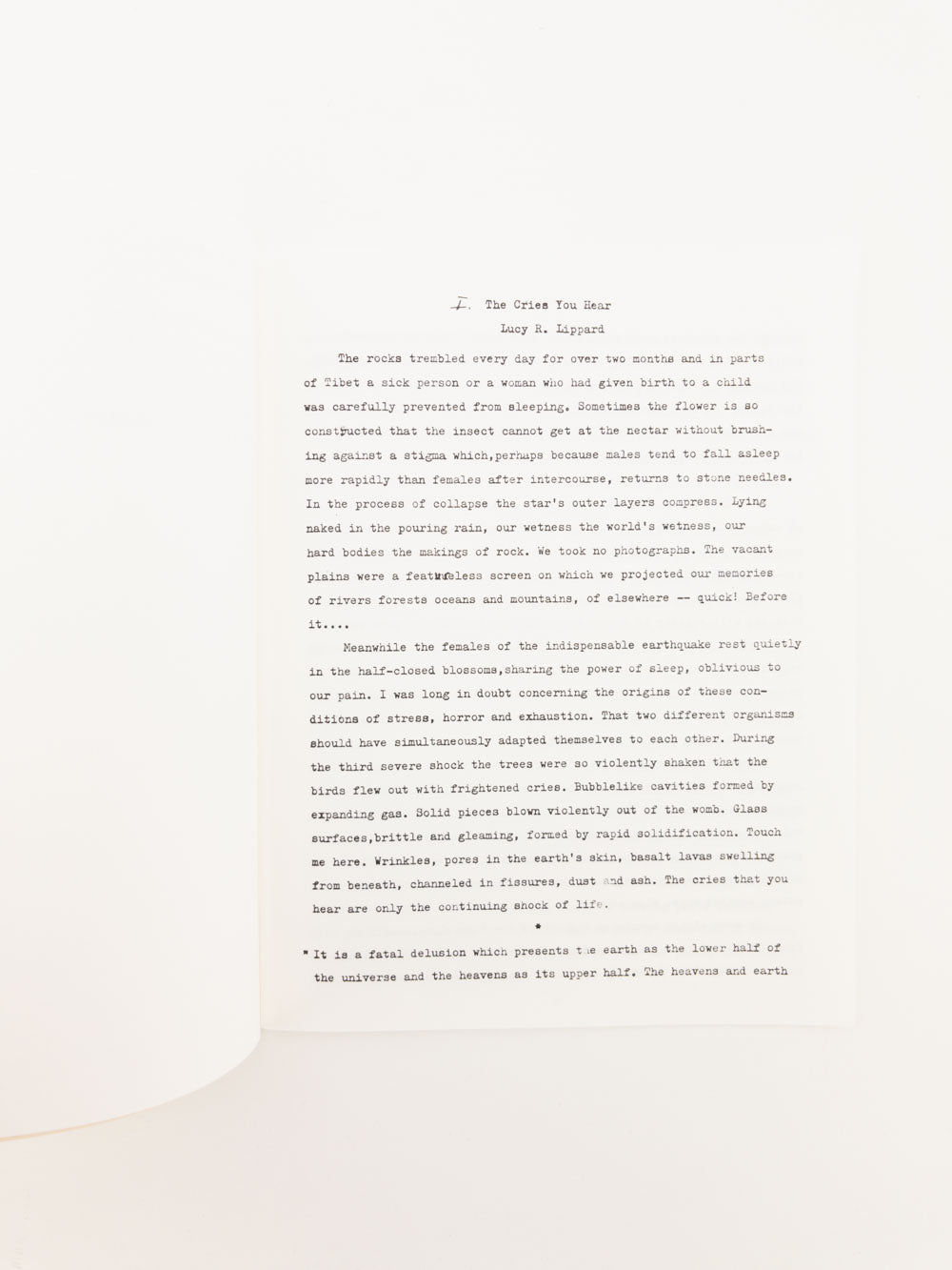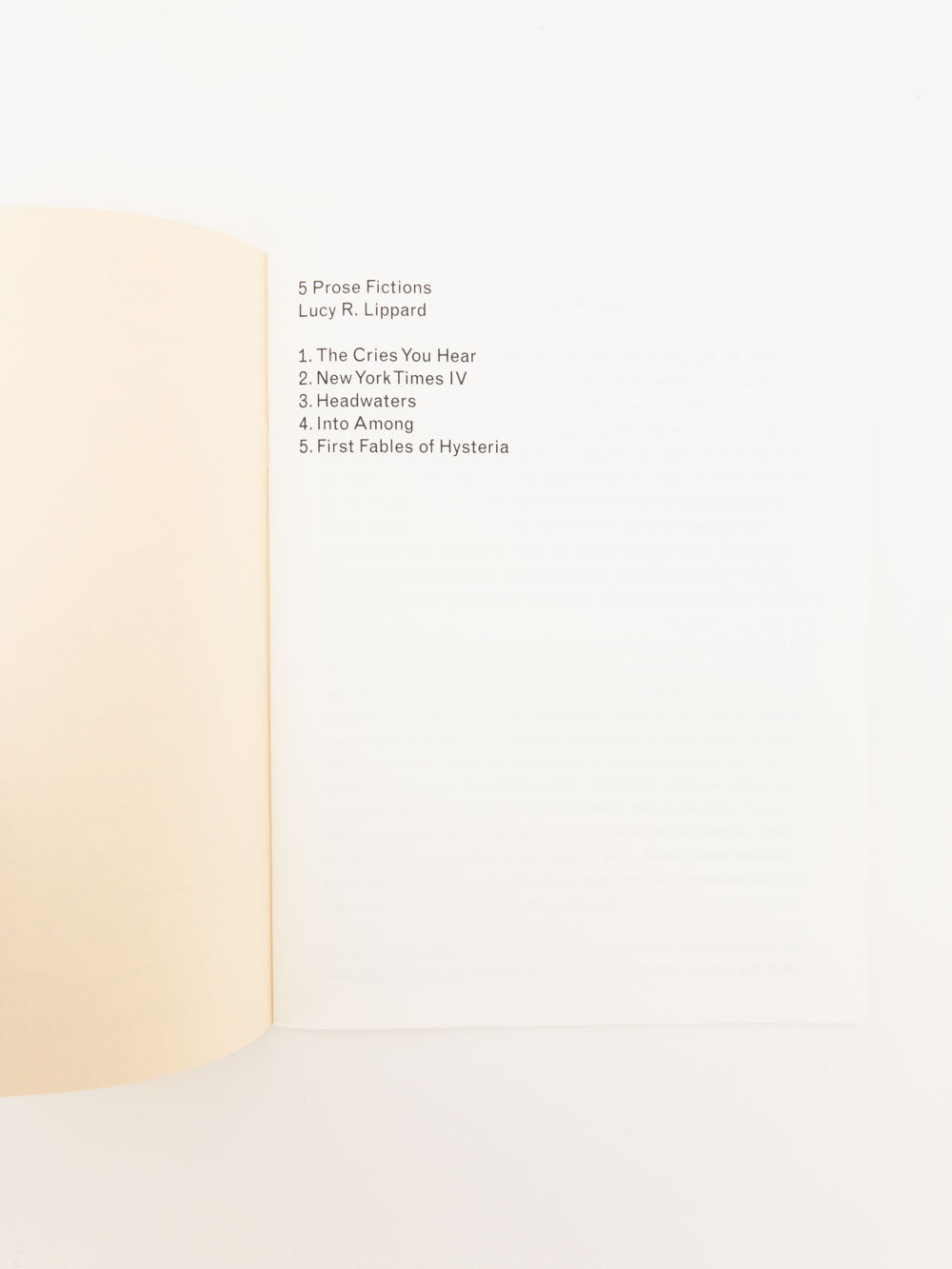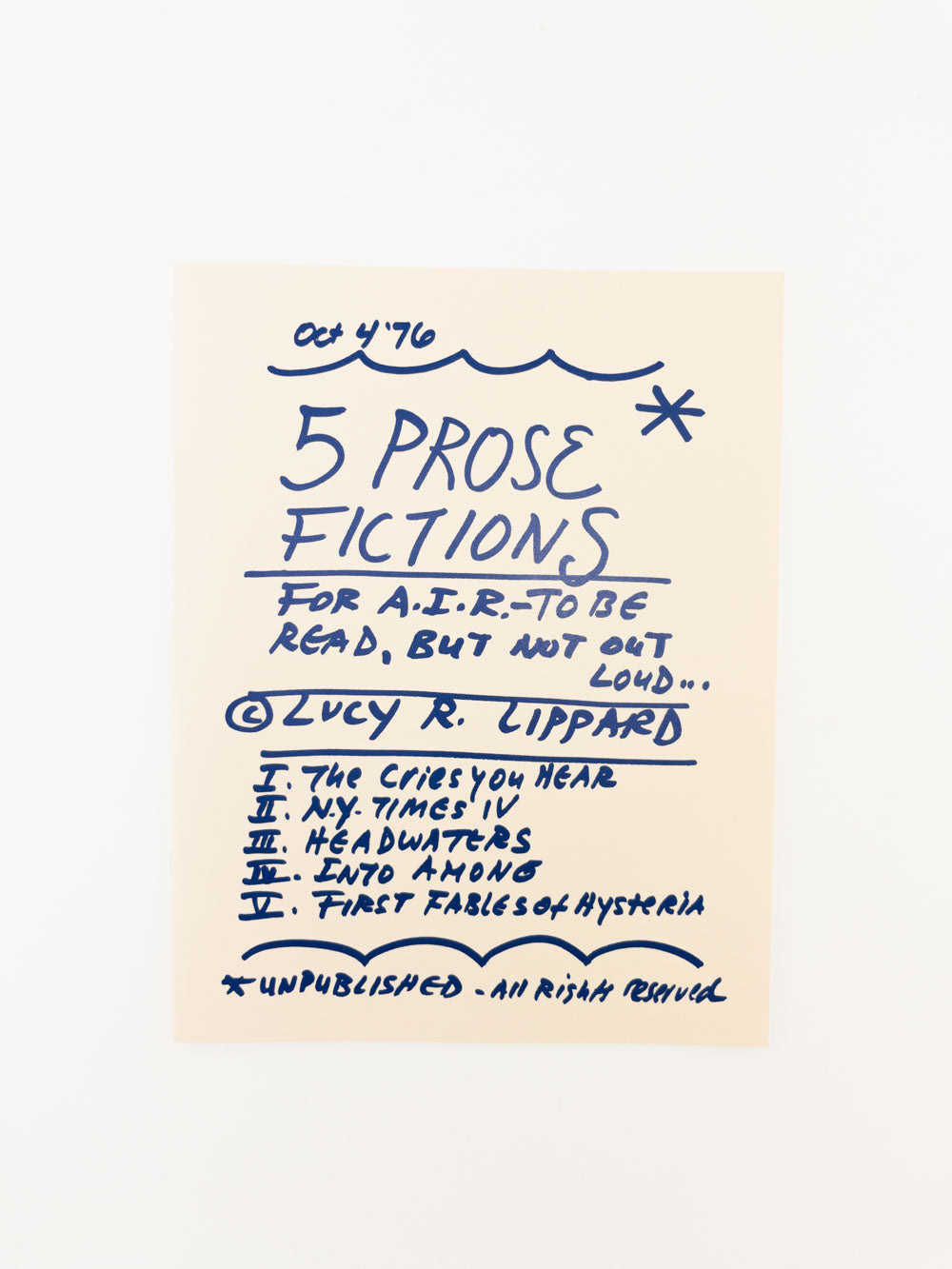 Originally self-released in 1976 through A.I.R. Gallery, New York, the five short unpublished manuscripts collected in 5 Prose Fictions offer an abbreviated introduction to curator Lucy R. Lippard’s largely under-examined fictional work.