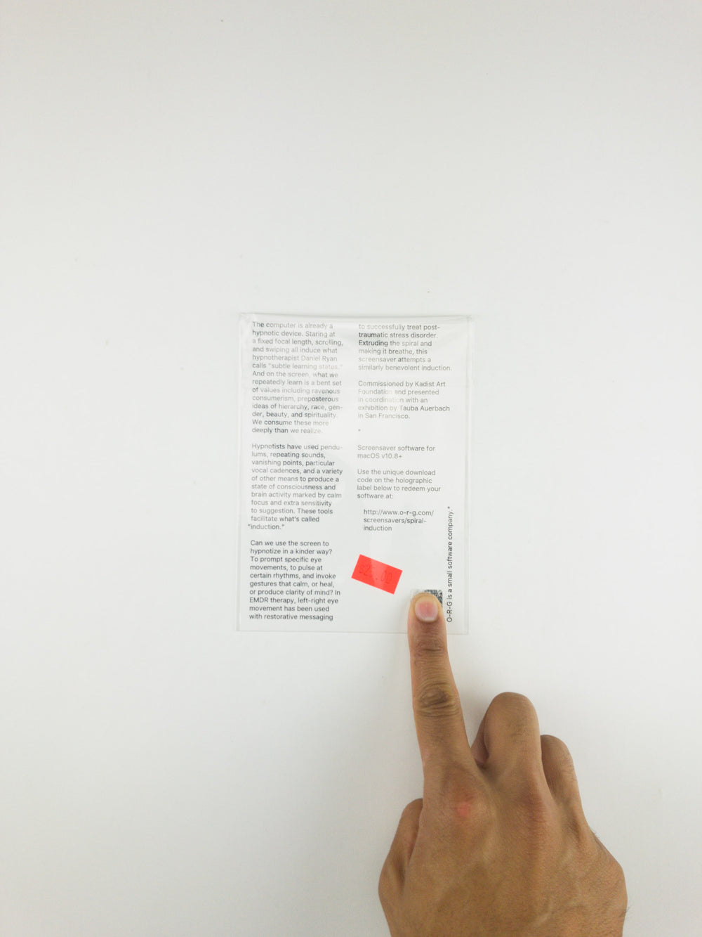 Can we use the screen to hypnotize in a kinder way? To prompt specific eye movements, to pulse at certain rhythms, and invoke gestures that calm, or heal, or produce clarity of mind? In EMDR therapy, left-right eye movement has been used with restorative messaging to successfully treat post traumatic stress disorder. Extruding the spiral and making it breathe, this screensaver attempts a similarly benevolent induction.