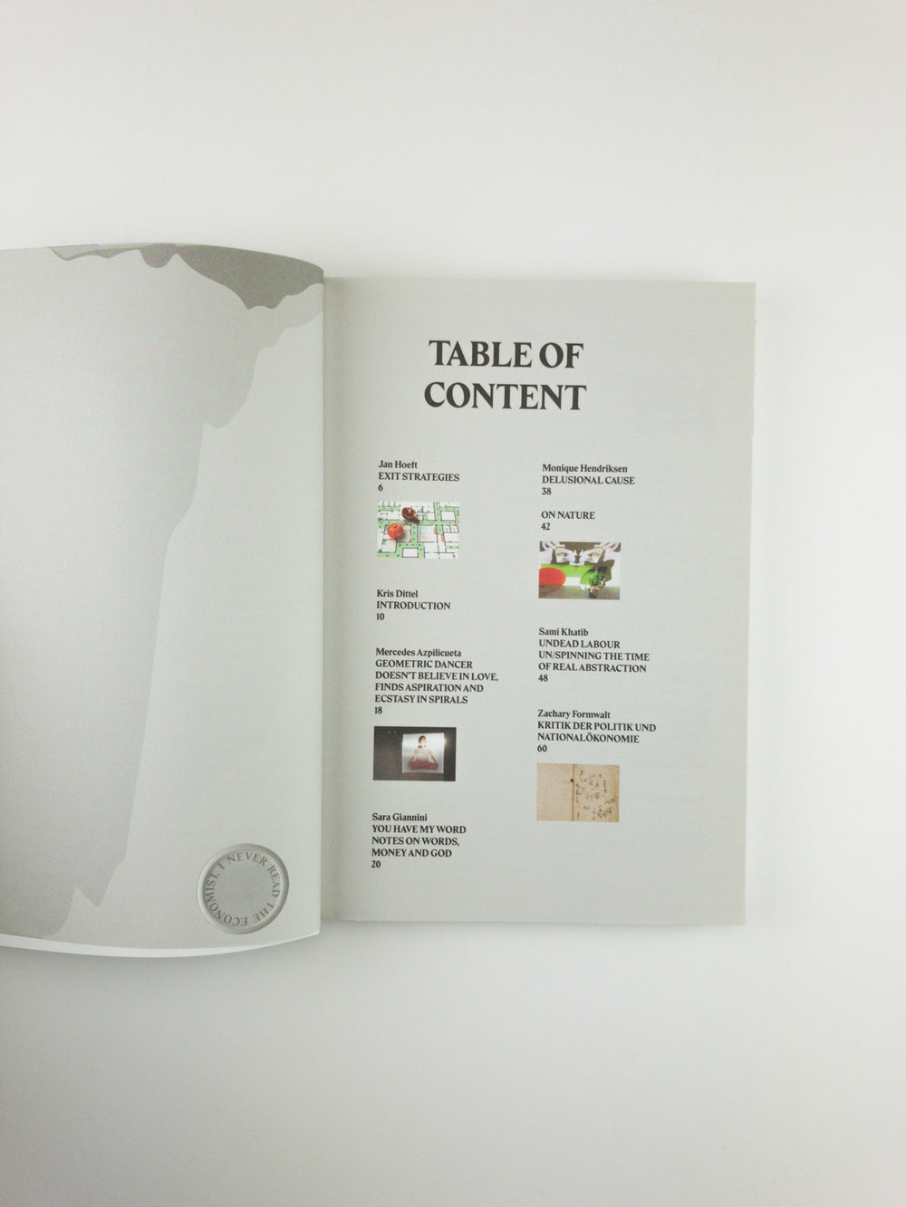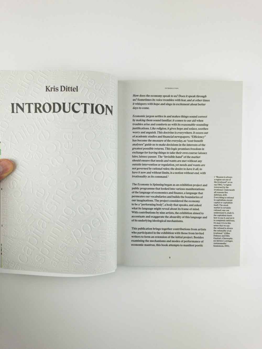 The Economy Is Spinning began as an exhibition project and public program aimed at exploring the language of economics and finance—a language that permeates our vocabularies and shapes our imagination. Contributions are by a group of nine international artists, writers and theorists including Mercedes Azpilicueta, Kris Dittel, Zachary Formwalt, Sara Giannini, Monique Hendriksen, Jan Hoeft, Sami Khatib, Hanne Lippard, Toril Johannessen, Robertas Narkus, Antonis Pittas, Nick Thurston, McKenzie Wark, and Rafaela Dražic, who together consider the economy as a “performing body” revealing itself through the underlying mechanisms of language. The fully illustrated softcover reader presents images, essays, and texts addressing how the language of economics and finance influences our thinking and expression. Kris Dittel is an independent curator and editor living and working in the Netherlands. She is an associate curator at the Onomatopee project space in Eindhoven, an art book publisher, and member of the research duo The Translation Trip, who investigates translation as practice, philosophical notion, and curatorial device.