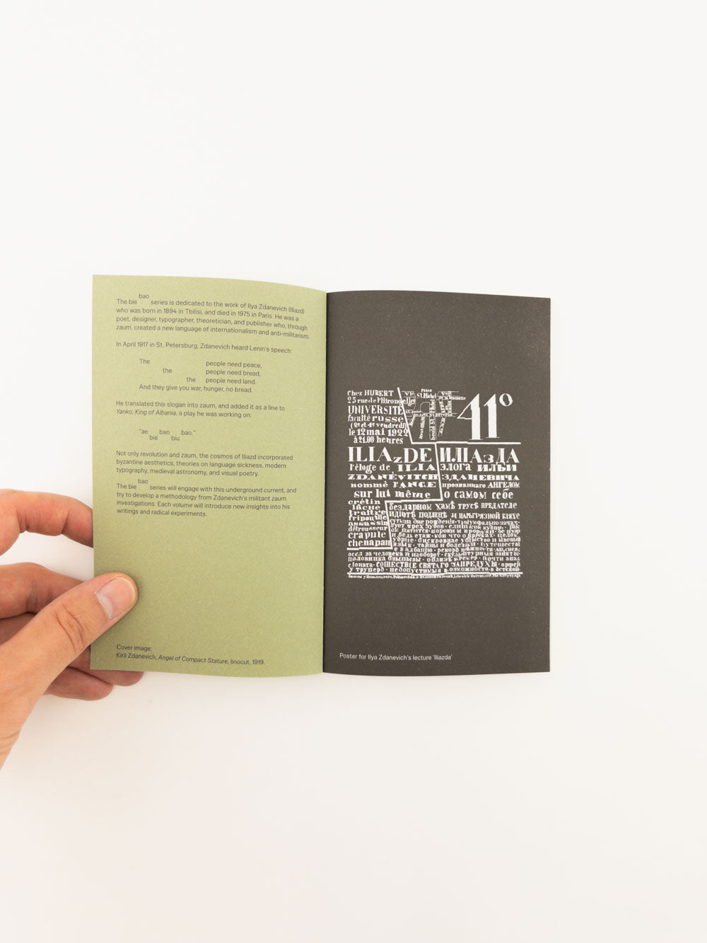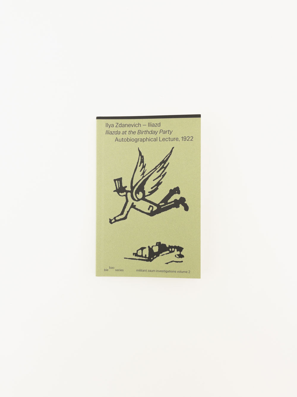 The second volume of the bie bao series presents a eulogy entitled Iliazda at the Birthday Party, a pseudo-autobiographical lecture delivered by Ilya Zdanevich in Paris in 1922. It reports on Zdanevich’s artistic and political adventures up until then. Along with an autobiography full of self-admiration, in this lecture Zdanevich gives an interpretation of his zaum dramas inspired by Freudianism, and humorously describes a colourful image of the Russian microcosm in Montparnasse.