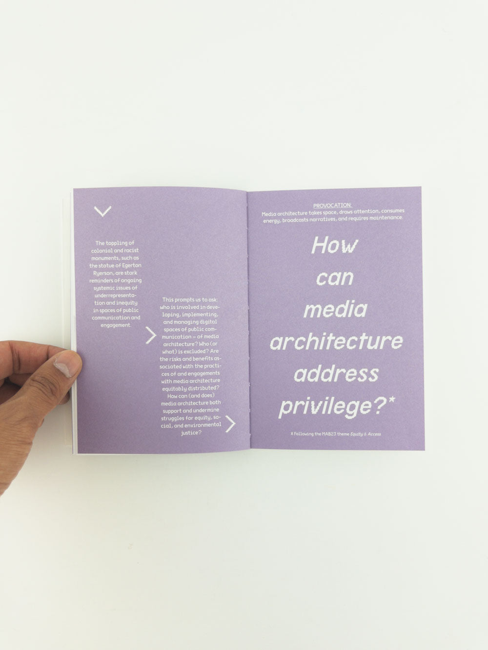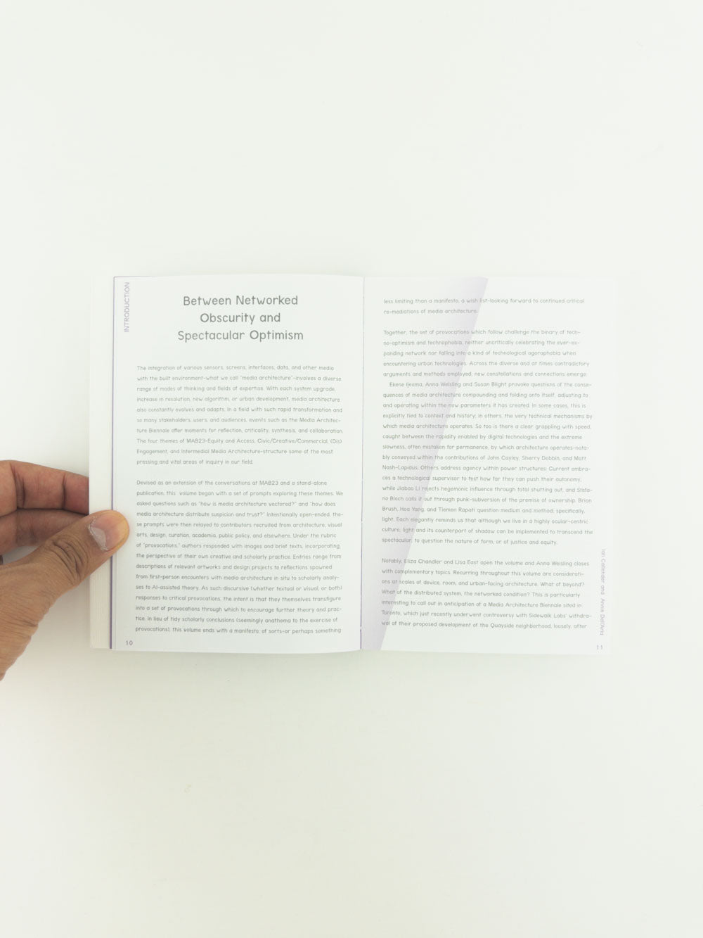 Intentionally open-ended and dialogical, Provocations on Media Architecture brings together twenty-one thought leaders across architecture, visual arts, design, curation, academia, and public policy to address these ideas and themes. Authors respond with images and brief texts, incorporating the perspective of their own creative and scholarly practice. Entries range from descriptions of relevant artworks and design projects to reflections spawned from first-person encounters with media architecture in situ to scholarly analyses to AI-assisted theory. These themselves transfigure into a set of provocations, supplanting the original questions which inspired their construction, through which to encourage further theory and practice. Across the diverse and at times contradictory arguments and methods employed, new constellations and connections emerge.