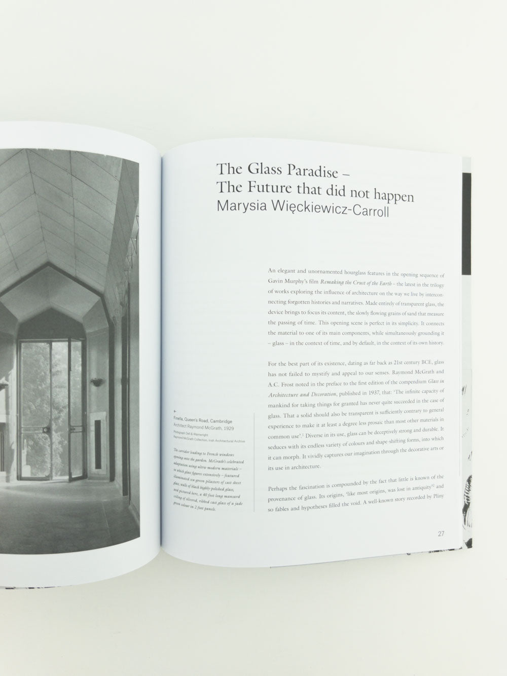 The publication features excerpts from the film Remaking the Crust of the Earth, a series of restaged photographic glass tests conducted by Gavin Murphy and Louis Haugh, and new essays by Marysia Wieckiewicz-Carroll and Chris Fite-Wassilak, alongside reproductions from the Raymond McGrath collection in the Irish Architectural Archive.