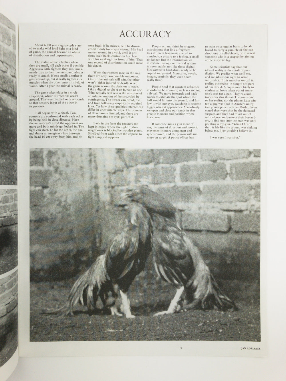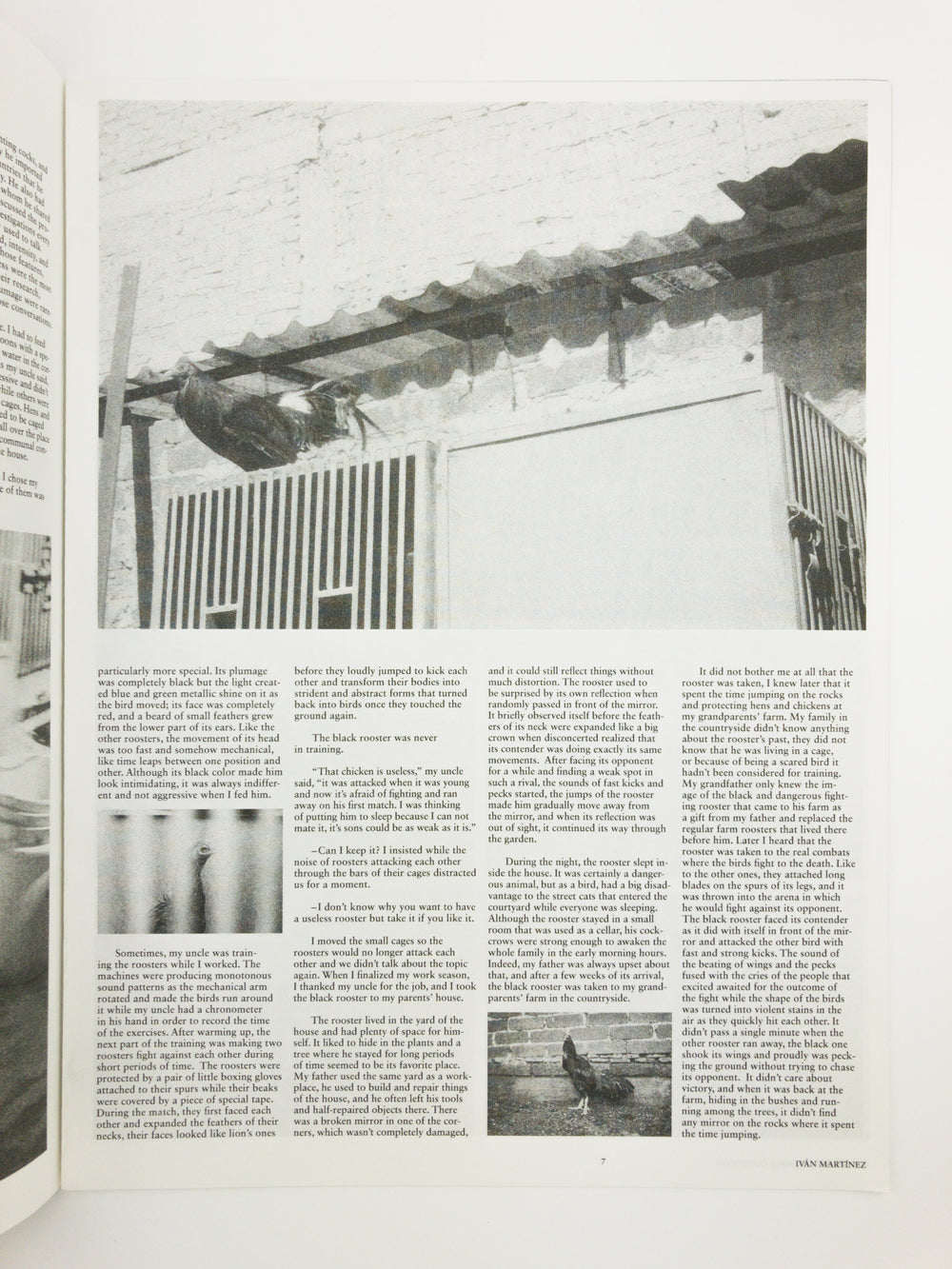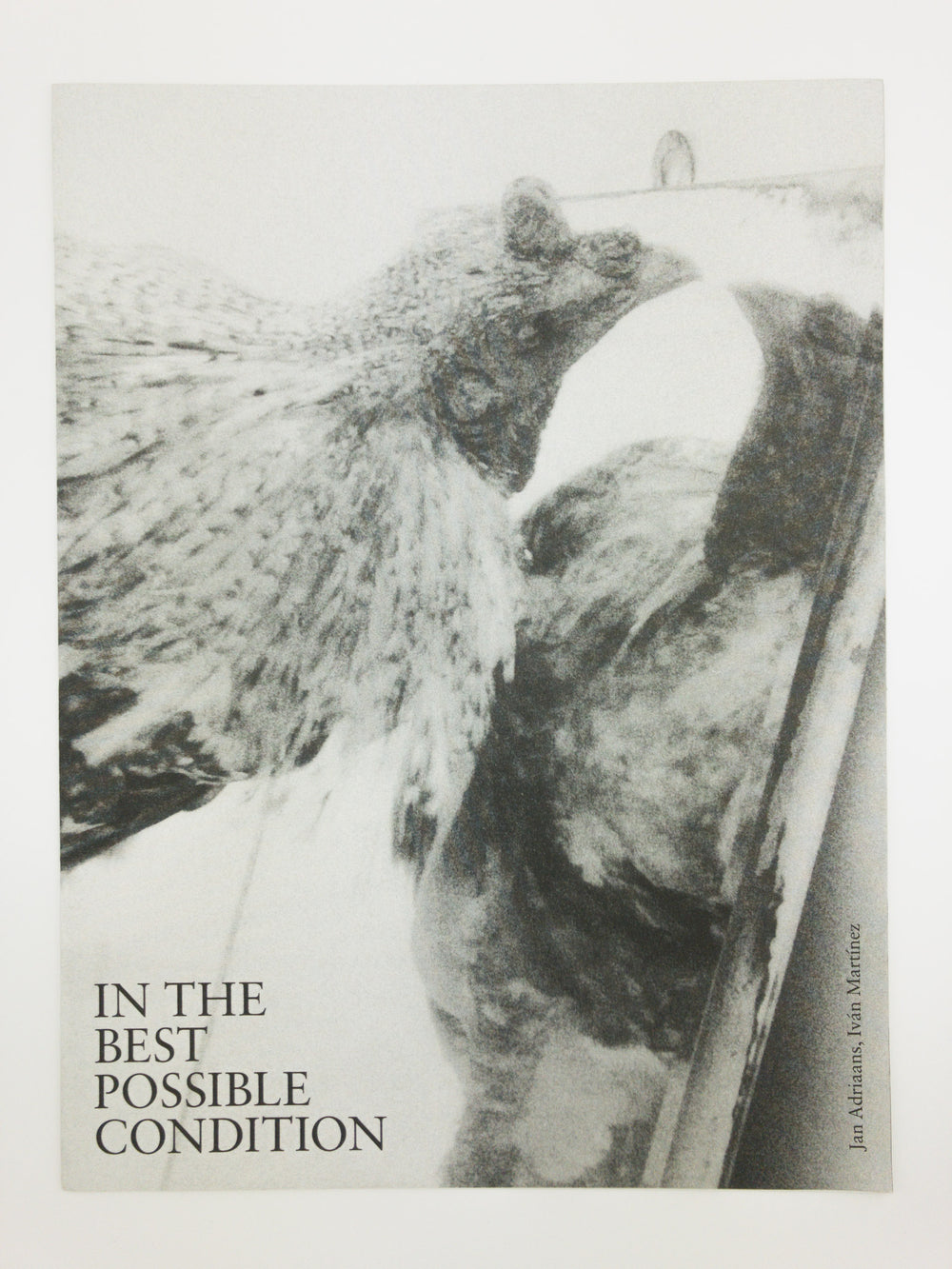 In The Best Possible Condition is an artist-publication in the shape of a tabloid. This publication is the product of a collaboration between Ivan Martinez and Jan Adriaans, departing from video works both artists made on a rooster farm in Mexico City. These roosters are bred for cockfights, which are allowed in some parts of Mexico. The imagery in the publication is stills from these videos and the design is made by Ivan Martinez. Six text-works/ short essays, written by six writers accompany the imagery, departing from or referencing the blood sports cock-fighting. A poetic reflection of a rooster looking in a mirror, a story of childhood and rooster breeding, a story on human and animal accuracy, concrete poetry on Tabula Rasa, a short history on the emergence of bodybuilding, and an essay on stress on the work floor.