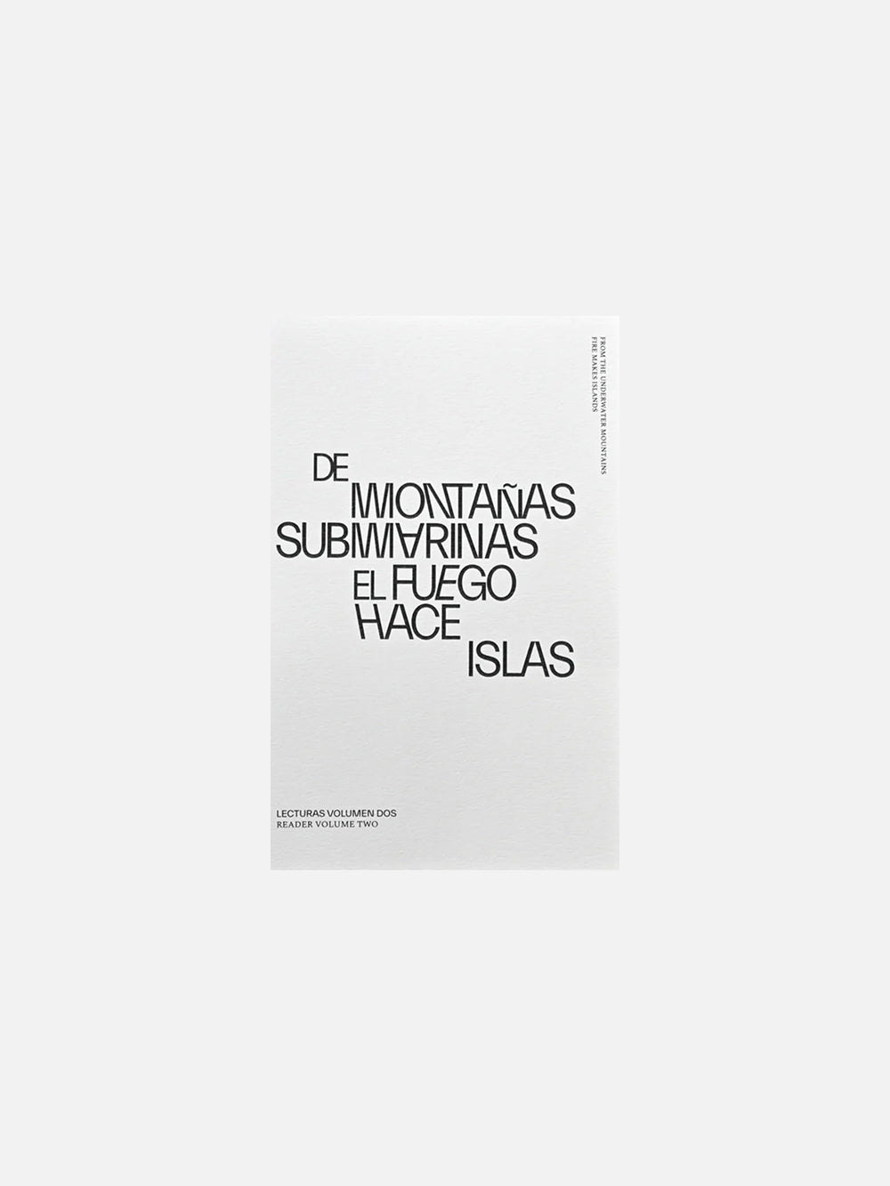 de montañas submarinas el fuego hace islas [from the underwater mountains fire makes islands] Reader Volume Two is a bilingual English and Spanish reader, edited by curator Yina Jiménez Suriel, and co-published by KADIST and Sming Sming Books, with the support of the Center for Latin American and Caribbean Studies, University of California, Berkeley. de montañas explores the concept of freedom through sensory experiences, alternate and altered realities, and interspecies relationships between human and non-human entities, using the island as a important reference point for imagination beyond the world in which we live. With texts by Dénètem Touam Bona, Félix Servio Ducoudray, Yina Jiménez Suriel, Ailton Krenak, Marilia Lourerio, José Maceda, Ariana Nuala, Suely Rolnik, and Jo-ey Tang, de montañas includes a constellation of voices that address the interconnection between the geological, perceptual, temporal, sonic, poetic, social and political forces.