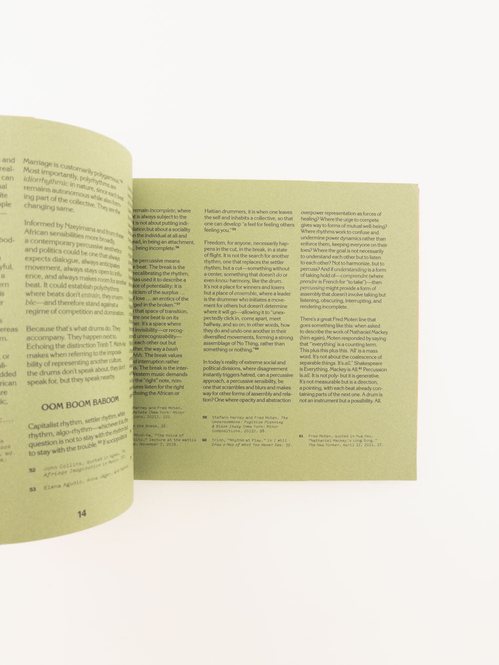 Curated by Anthony Huberman, the exhibition brings together works in a variety of media to explore rhythm, pulse, music,cultural history, healing, power, freedom,and control. The book includes a new essay by the curator, images by the artists, as well as short texts about specific terms that make up a vocabulary of percussion, such as beats, drumming, rhythm, tempo, and others. Writers include Geeta Dayal, Lê Quan Ninh, Hannah Black, Hypatia Vourloumis, Natasha Ginwala, JJJJJerome Ellis, Will Holder, and Hamza Walker &Anthony Elms.