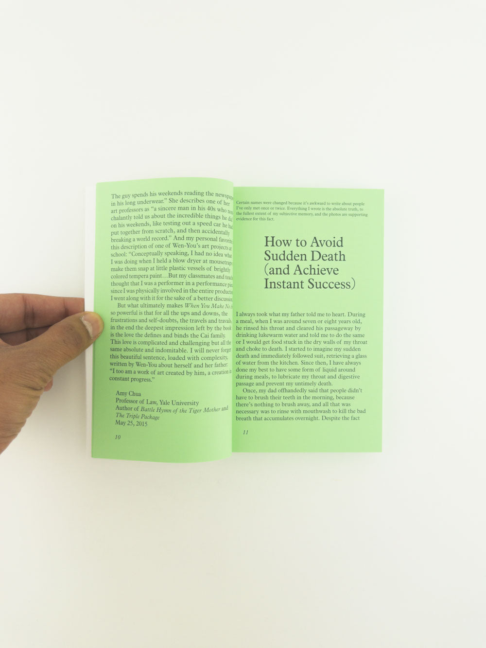 Wen-You Cai, Founder and Director of Special Special, shares an autobiographical account of growing up in the art world. Each chapter holds inspirations and vignettes from museums, travels, and random encounters around the world that inspired the formation of Special Special as an art project space and retail shop. Cai conceptualizes the idea of a “reluctant artist”, or someone who is immersed in the arts but having trouble making work. Foreword by Amy Chua.