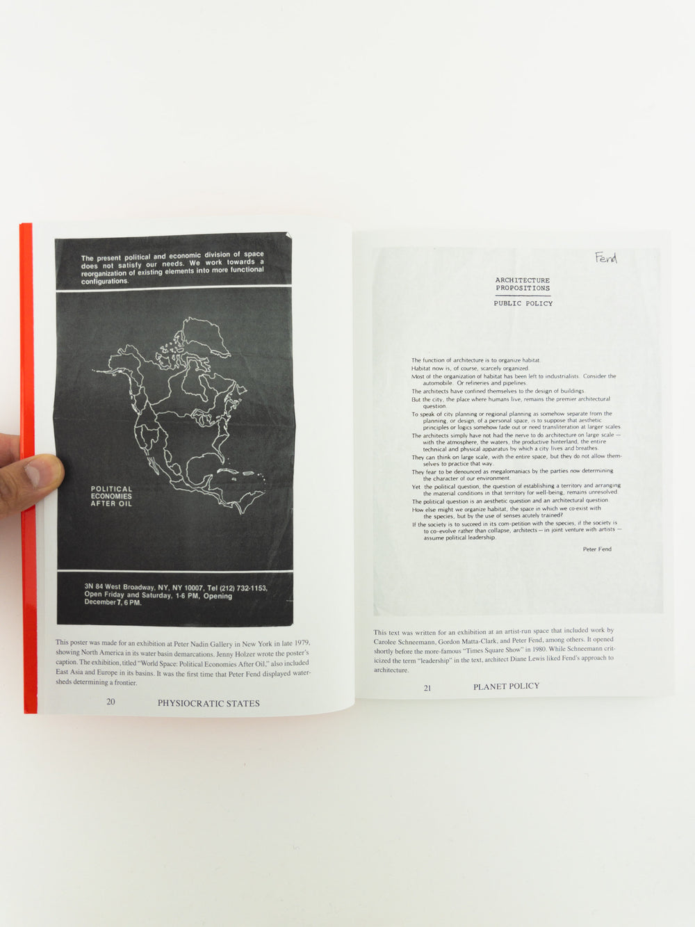 What if art holds the solution to the unfolding ecological and economic crises of our time? For more than forty-five years, Peter Fend has argued that art premonitions material culture, therefore the means of production, ensuing changes in social relations. Hence, in his view, works by Marcel Duchamp, Carolee Schneemann, Mary Beth Edelson, Paul Sharits, and others, can prefigure ecological restoration and cohabitation. In the late 1970s, artists in New York initiated teams—first Colab, The Offices, and later Ocean Earth and Space Force—to move from critique into effecting real-world change. Initiatives came from Jenny Holzer, Coleen Fitzgibbon, Taro Suzuki, Joan Waltemath, and Eve Vaterlaus, among others, who linked up with scientists to produce reports and analyses with satellite imagery for news media.