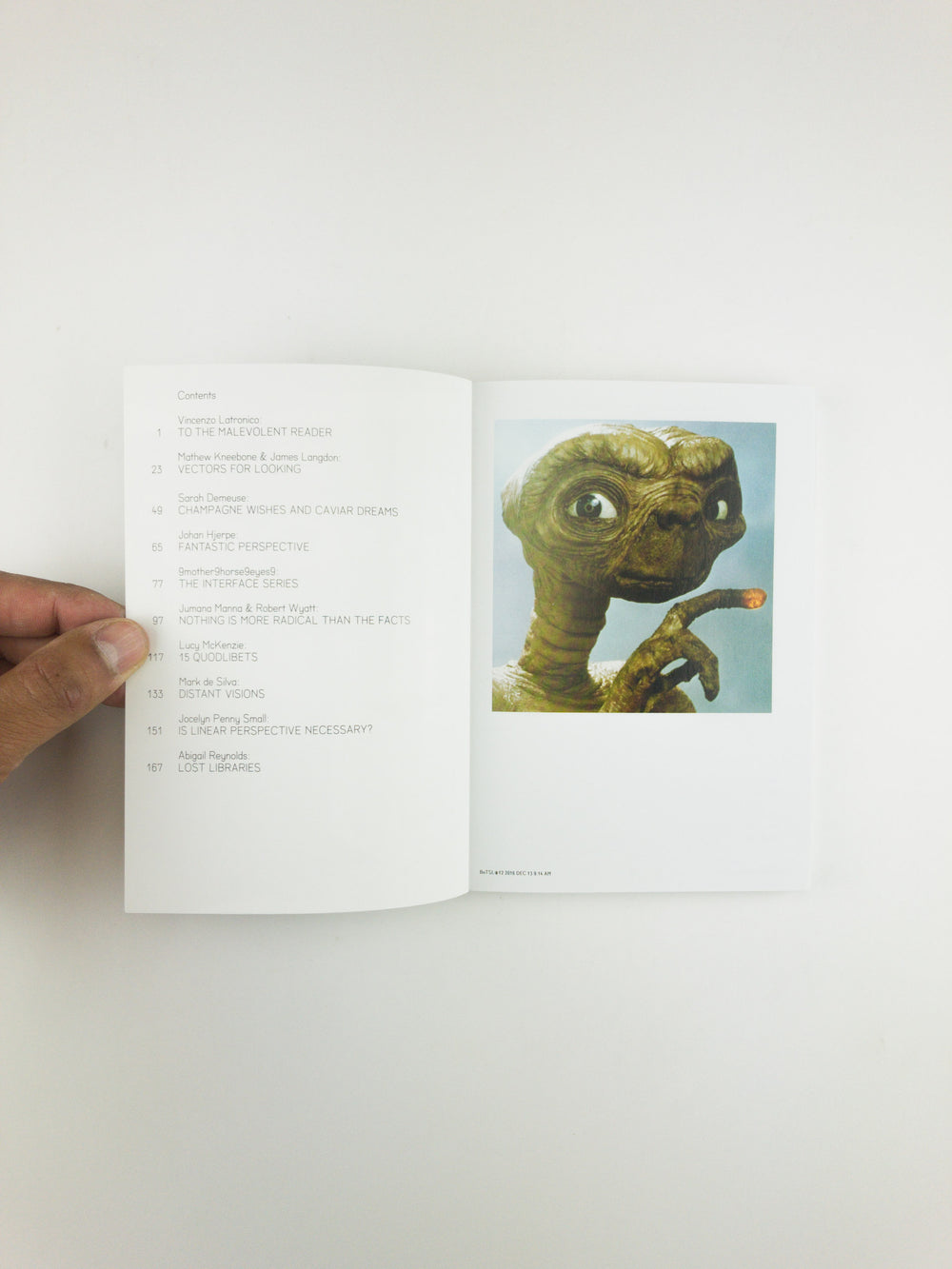 This issue comprises various outlooks on “perspective.” This might be taken to mean something as specific as a particular opinion or as general as an axonometric projection; in short, different ways and means of looking at the world. And so we find Vincenzo Latronico attempting to get in touch with E.T., a collection of Lucy McKenzie’s illusory quodlibets, a conversation between Jumana Manna and Robert Wyatt on art and ethics, timely analysis of “Lifestyles of the Rich and Famous” by Sarah Demeuse, along with other points of view from Mark de Silva, Jocelyn Penny Small, Abigail Reynolds, James Langdon & Mathew Kneebone, Johan Hjerpe, and the inimitable 9mother9horse9eyes9.