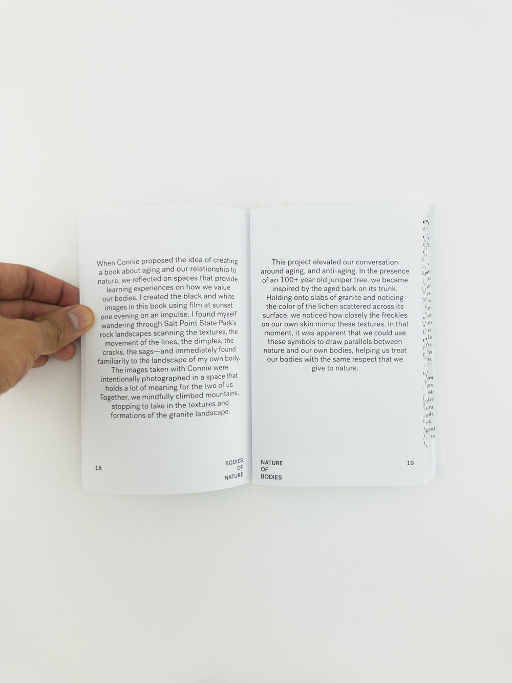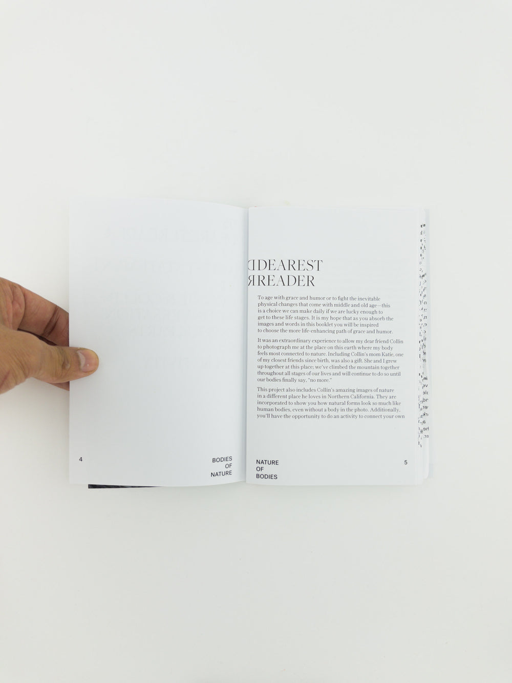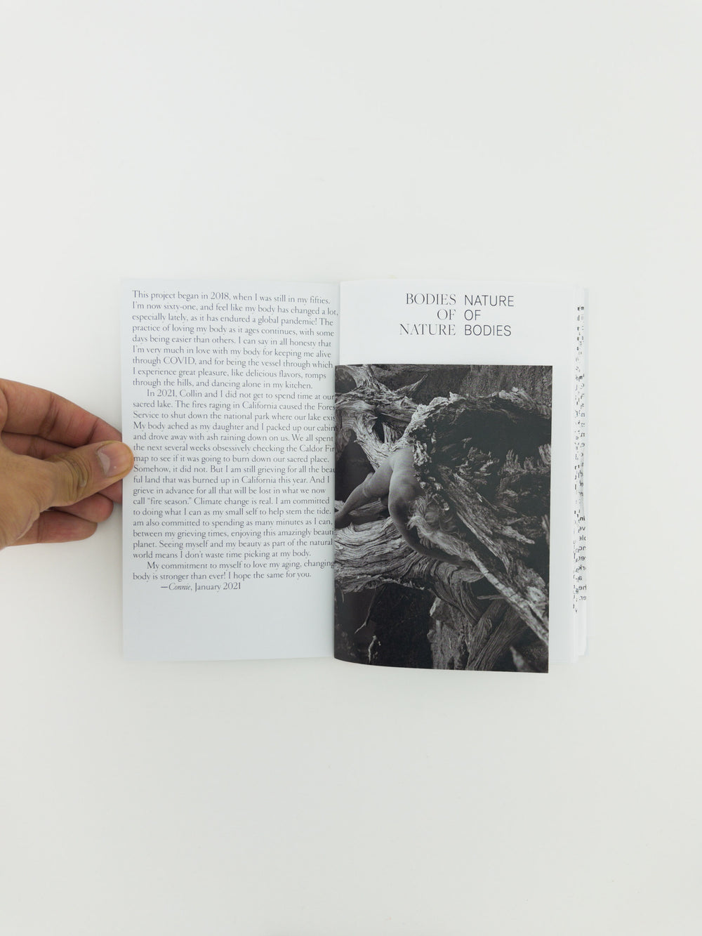 In 2018, Connie Sobczak and Collin Morrow began a project about aging and nature. Connie is the author of Embody: Learning to Love Your Unique Body (and quiet that critical voice!), creator of the Wise Woman Council, and serves as the executive director of the nonprofit The Body Positive; Collin is a photographer and gardener. Their intention was to draw parallels between nature and bodies with an eye towards exploring aging. This booklet centers around two series of Collin’s photographs: one of Connie’s body in nature, the other of rock landscapes. The booklet also contains statements by both collaborators; a mindfulness activity; and a conversation between Connie and Collin that focuses on the project in the context of their long, cross-generational friendship, but also meanders through topics like magic, queer identity development, eating disorders, ego, and more.