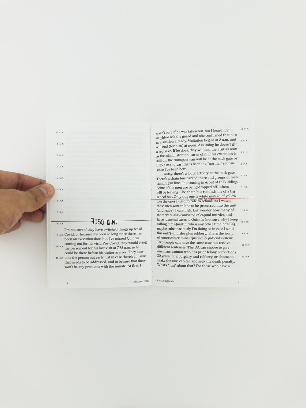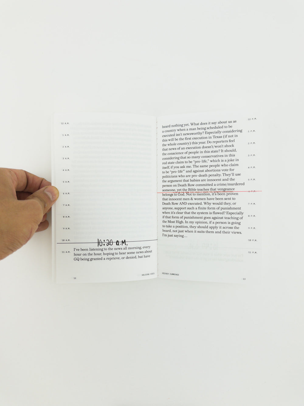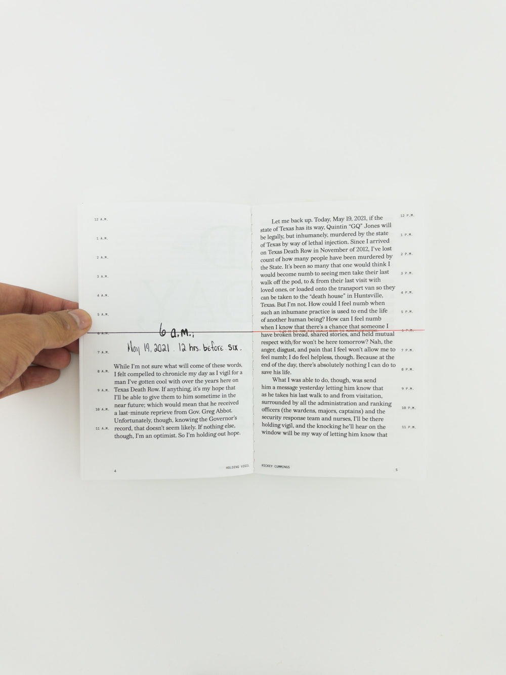 Holding Vigil is a diaristic account of a friend’s execution, written by Rickey Cummings from Texas’ Death Row. From Rickey Cummings’ foreword: