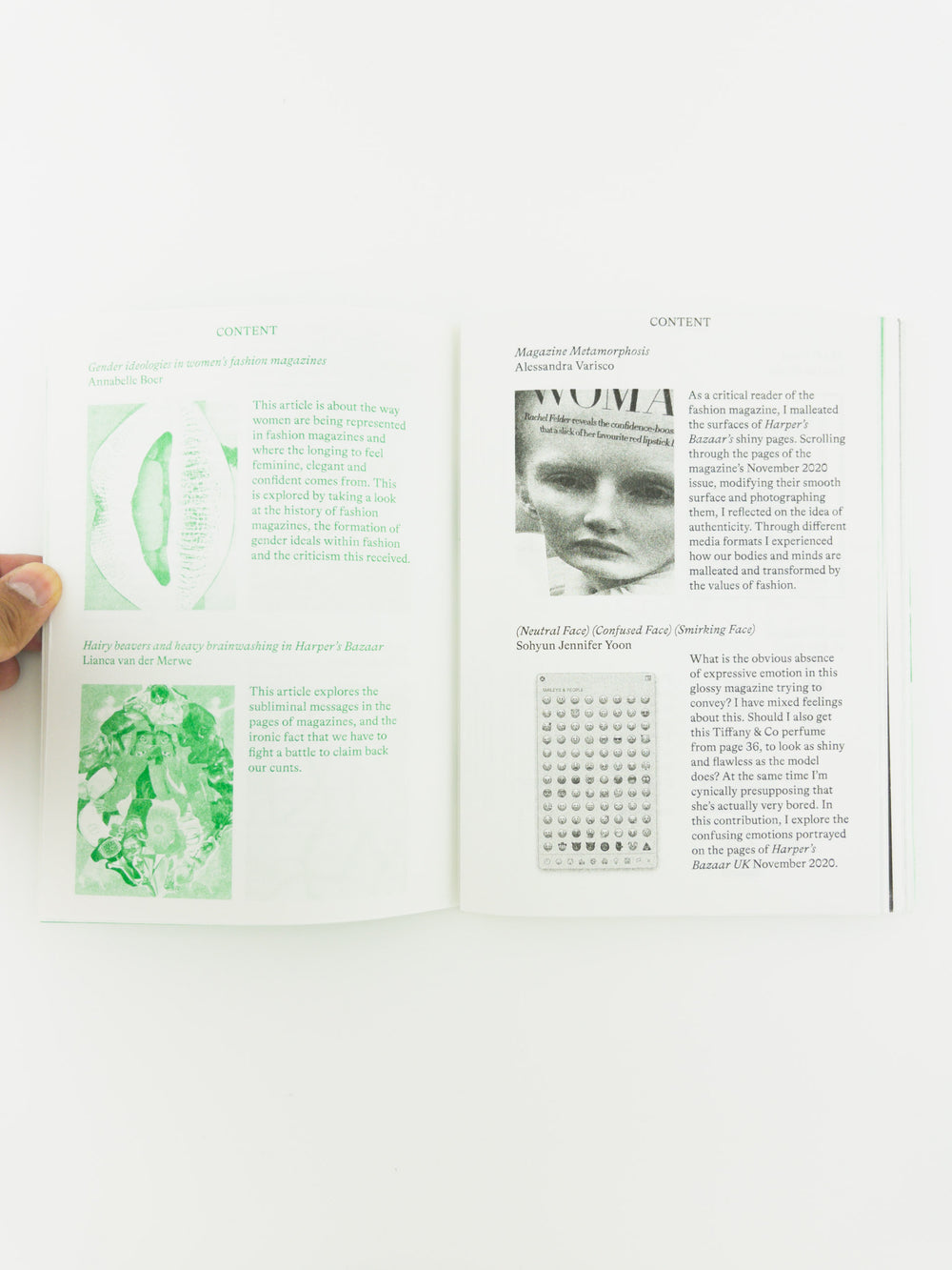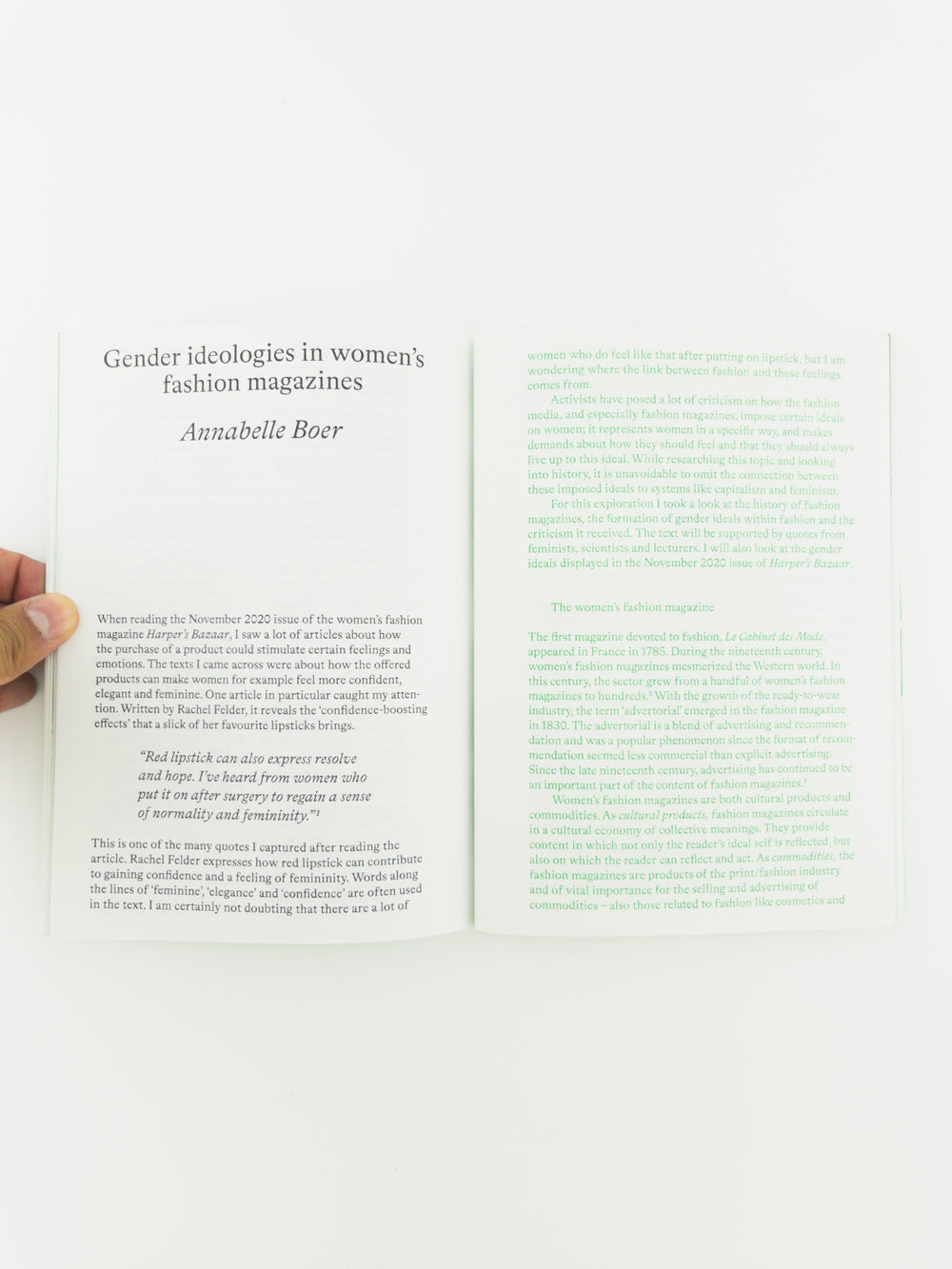 This edition of A Magazine Reader, that took place at MA Critical Fashion Practices at ArtEZ University of the Arts in collaboration with Chet Bugter and graphic designer Zuzana Kostelanská, revolves around the idea of the ‘culture of emotions’, self-help, therapy and self-transformation within the construct of fashion. Besides our constantly changing looks, that are expressions of fluid identities, our minds and ‘inner selves’ are also ever changing and the idea of transformation is pushed beyond changing clothes or moving between traditional forms of status in society. Being responsible for our own emotional state of mind as something that should be transformed to a higher sense of being, todays fashion is strongly focussed on self-care, therapy and self-transformation and has connected this to symbols, object and situations. The fashion magazine is one of the cultural formats in which this societal focus becomes clearly visible and commodified.