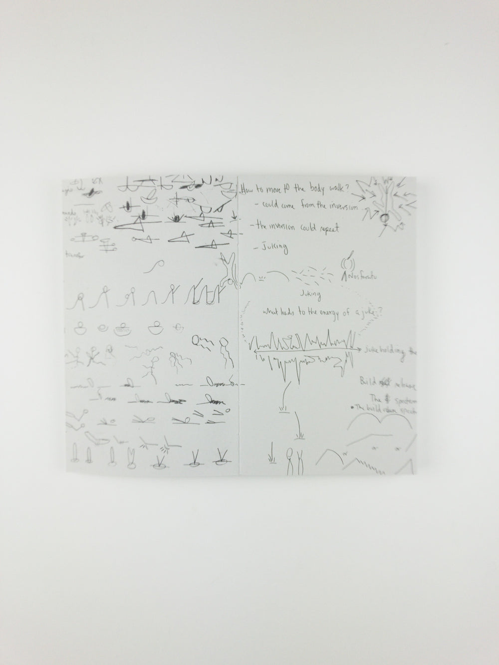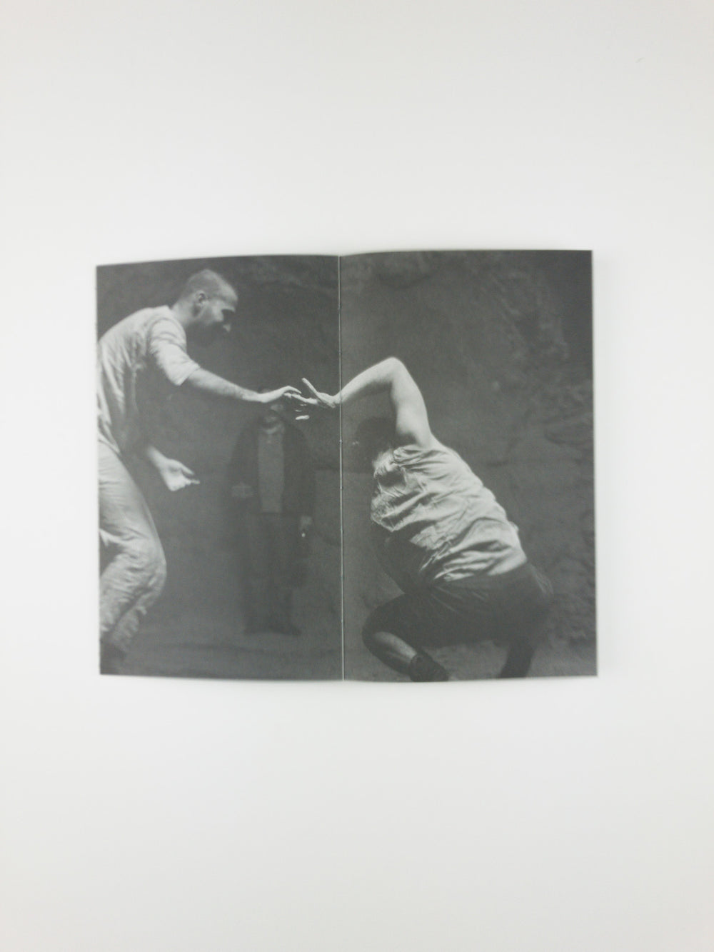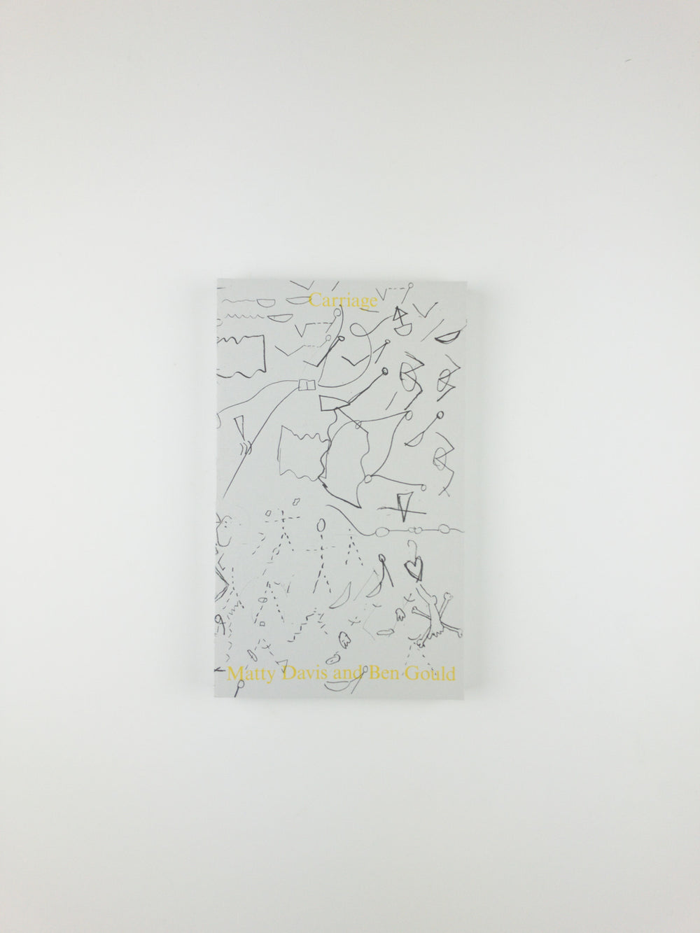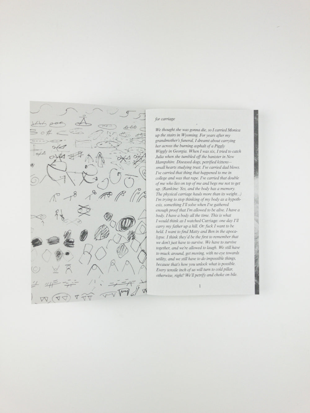 Created in collaboration with designers Ayham Ghraowi and Matt Wolff, this publication includes writing, photographs, and drawings to evoke the urgent physical and interpersonal landscape of Carriage. The artists bear witness to themselves and to each other as they undergo a wide range of physical and emotional dynamics that navigate trust, need, difficulty, and joy. The temporal and spatial experience of Carriage is resituated on the page, as are Davis and Gould's voices, which build off of each other, overlap, and merge as first person singular and plural meet. Their voices are joined by reflections from audience members who attended Carriage in its various locations— aboard a moving vessel on the Chicago River, in a limestone cave network in Kansas City—which offer insight into the viewers’ own bodies and unique physical and psychological spaces. As these voices combine and accumulate, a broader portrait emerges, not only of a performance, but of the intricacies of human vulnerability, challenge, and care.