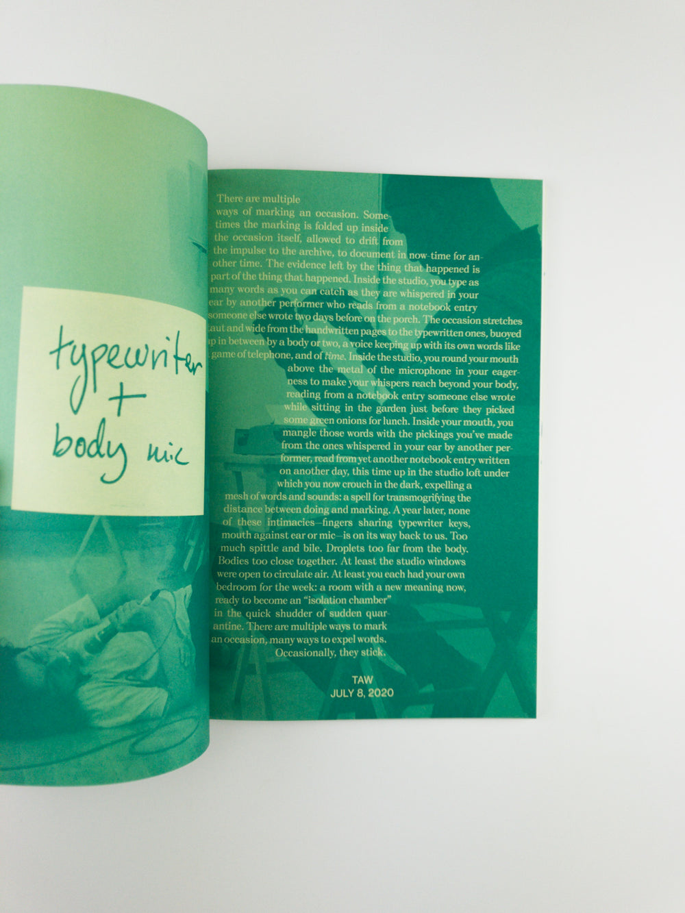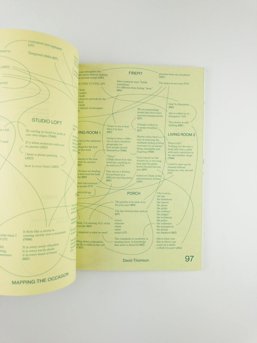 Marking the Occasion represents the final movement in a year-long engagement with the question, "Can a performance be a rough draft of a written work?" In this case, the rough draft took place at Mount Tremper Arts during a 2019 Watershed Residency. Taking the practices of choreography and co-writing as methods of investigation, curator-editors Jaime Shearn Coan and Tara Aisha Willis introduce new trajectories for live work and text by bringing together dance and performance artists from across the US who occupy multiple roles within art economies and in whose work language and writing are prevalent. Exploring a multiplicity of lived, embodied experiences within a single event, Marking the Occasion gathers together archival materials from the residency alongside new contributions from participants David Thomson, Julie Tolentino, Mariana Valencia, Takahiro Yamamoto, and Mlondi Zondi. The publication also marks the events of 2020, and traces their reverberations through each artist's practice as time, movement, action, and collaboration take on new meanings.