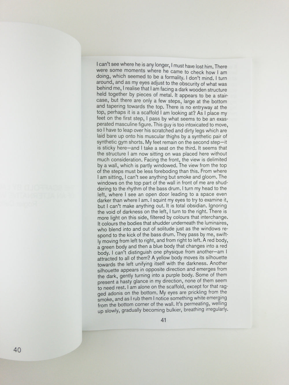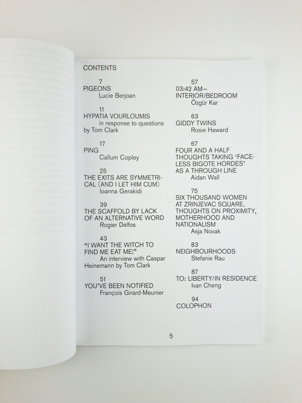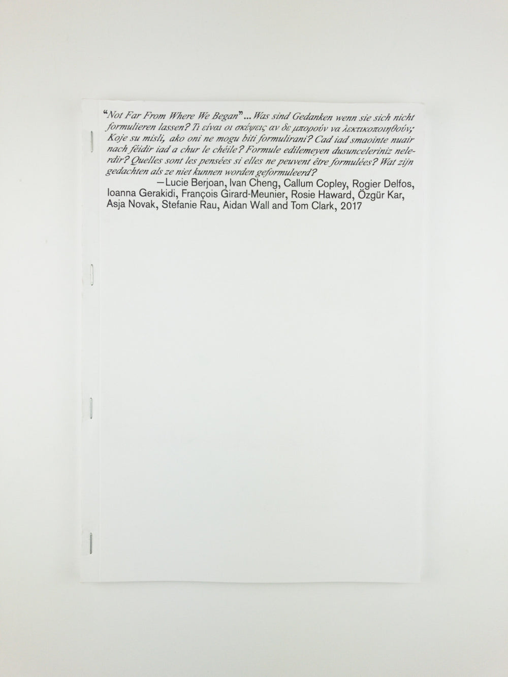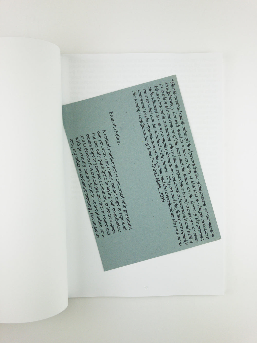 This publication is the result from a workshop with Tom Clark at the Critical Studies department of the Sandberg Instituut. The bound texts were written beforehand, responding to a prompt on the theme of “proximity”. The loose-leaf text, an “editorial”, was written and edited during the workshop and reflects on the process over those three days.