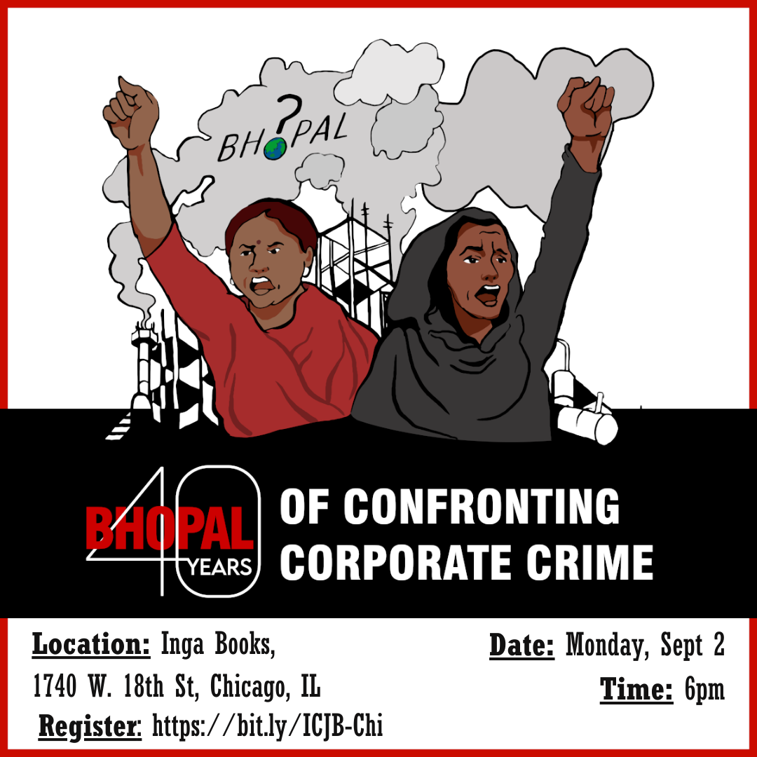 2024 marks the 40th anniversary of the Bhopal gas leak disaster, which remains the worst industrial disaster in history. For nearly four decades, gas-exposed communities in Bhopal continue to face significantly higher mortality rates, various diseases, neurological disorders, and two generations of birth defects. Today, well over 150,000 people in Bhopal are battling chronic illnesses that are related to their own exposure or that of their parents, and 500,000 lives remain physically and economically harmed from the disaster. These survivors will present an account of how gas-exposed communities in Bhopal have persisted for 40 years, treating illness and documenting the continued environmental pollution and damage to health faced in their communities. We will also discuss how the fight for environmental justice in Bhopal is fundamentally linked to the fight for environmental justice in Chicago, and how international solidarity can empower our movements for liberation.