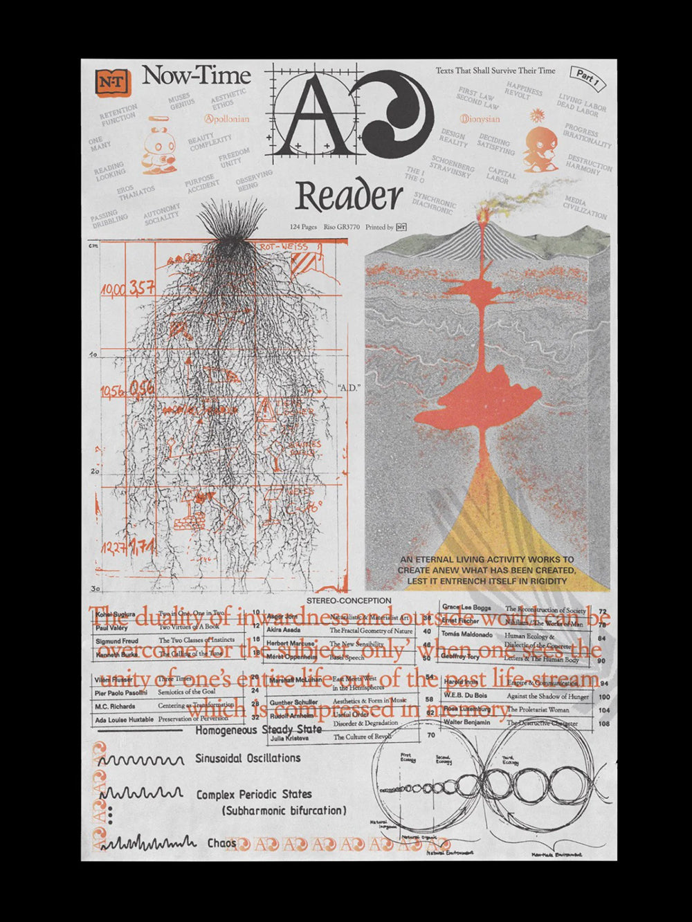 Selections from: Kohei Sugiura, Paul Valéry, Sigmund Freud, Kenneth Burke, Vilém Flusser, Pier Paolo Pasolini, M.C. Richards, Ada Lousie Huxtable, Asger Jorn, Akira Asada, Herbert Marcuse, Méret Oppenheim, Marshall McLuhan, Gunther Schuller, Rudolf Arnheim, Julia Kristeva, Grace Lee Boggs, Ernst Fischer, Tomás Maldonado, Geoffroy Tory, Harold Innis, W.E.B. Du Bois, Rosa Luxemburg, Walter Benjamin