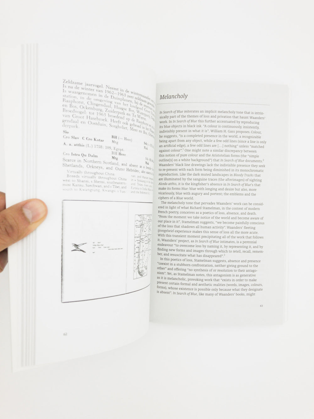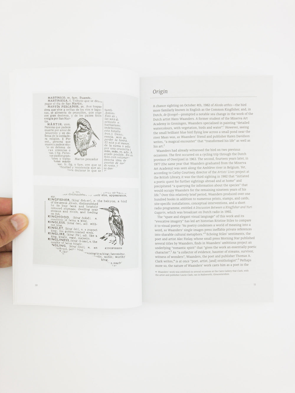 On an October day in 1982 the Dutch artist Hans Waanders witnessed a kingfisher flying across a small pond near the river Maas. This singular moment prompted an extended quest for the elusive bird that persisted for the remaining nineteen years of his life. Waanders’ pursuit of the kingfisher became an expansive endeavour that both adopted and subverted methods of archiving, classification, mapping, and etymology. In a series of thematic essays, Ross Hair examines Waanders’ work in close detail—from the commonality of the kingfisher, to its broader context in art and literature, and the species’ associations with colour and reverie, and time and space.