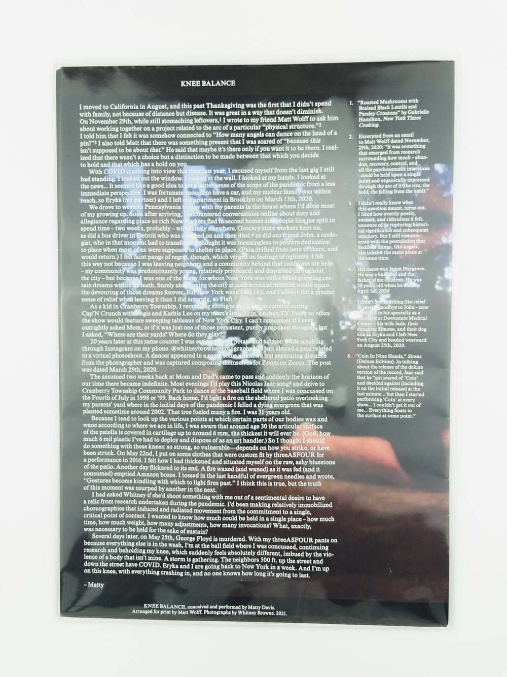 KNEE BALANCE (2021) is a performance that uses choreography, writing, photography, and design to traverse particular anatomical, personal, and sociopolitical arcs. Time oscillates and fractures movement. Space unfolds. Situated before a hearth in the throes of balance, the performer becomes a crucible for memory, durability, and the reciprocal relationship between the present and the unforeseen.